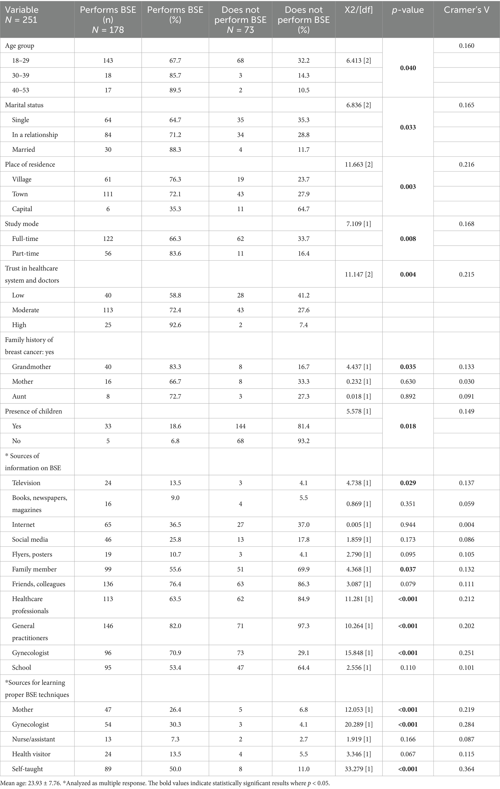 Statistical analyses showed a significant association between performing BSE and sources of information. Among those who performed BSE, 64.2% received information from a healthcare professional, while only 15.1% of those who did not perform BSE received such information. Information obtained from general practitioners also showed a significant correlation (82.0% vs. 9.6%). Information received from family members was also significantly associated with BSE practice (55.6% vs. 30.1%) particularly when BSE was learned from the mother (73.6% vs. 6.8%). Education provided by gynecologists (53.9% vs. 19.2%) and self-directed learning (50.0% vs. 11.0%) also showed a significant association with BSE practices.