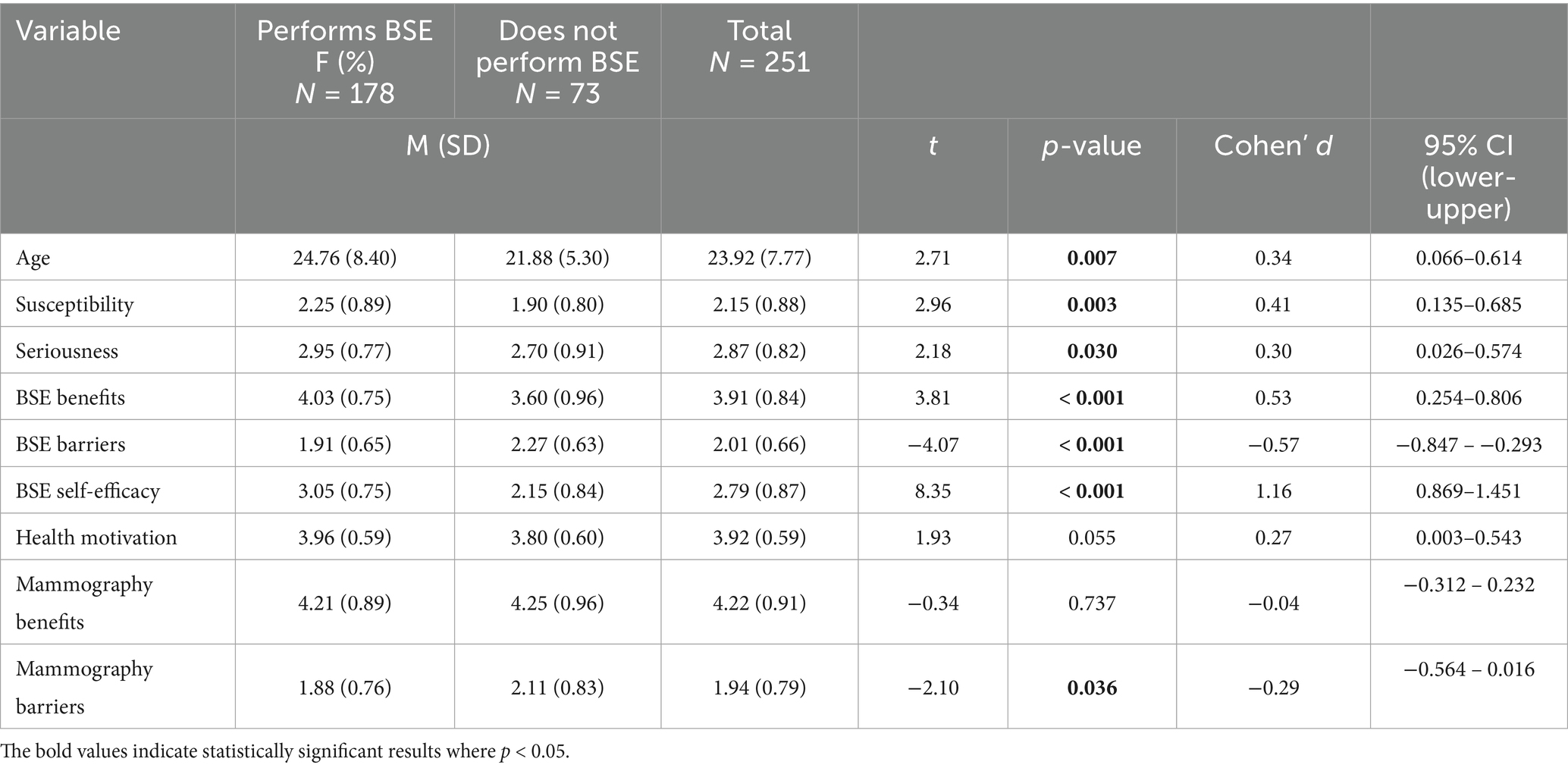 Table 3 presents the association between BSE practice and dimensions of the HBM, including effect sizes (Cohen’s d) with corresponding 95% confidence intervals. Students who performed BSE were significantly older (M = 24.8 vs. 21.9 years, p = 0.007) and reported higher perceived susceptibility (M = 2.25 vs. 1.90, p = 0.003), seriousness (M = 2.95 vs. 2.70, p = 0.030), benefits (M = 4.03 vs. 3.60, p < 0.001), and self-efficacy (M = 3.05 vs. 2.15, p < 0.001), along with lower perceived barriers (M = 1.91 vs. 2.27, p < 0.001). No significant differences were observed in health motivation or perceived benefits of mammography, whereas perceived barriers to mammography were lower among BSE performers (M = 1.88 vs. 2.11, p = 0.036). Taken together, the analysis of HBM dimensions showed that self-efficacy emerged as the strongest predictor of BSE practice, indicating that confidence in one’s ability to correctly perform BSE is essential. Perceived barriers and lower perceptions of severity reduced the likelihood of practice, while better knowledge of BSE and trust in healthcare providers supported engagement.