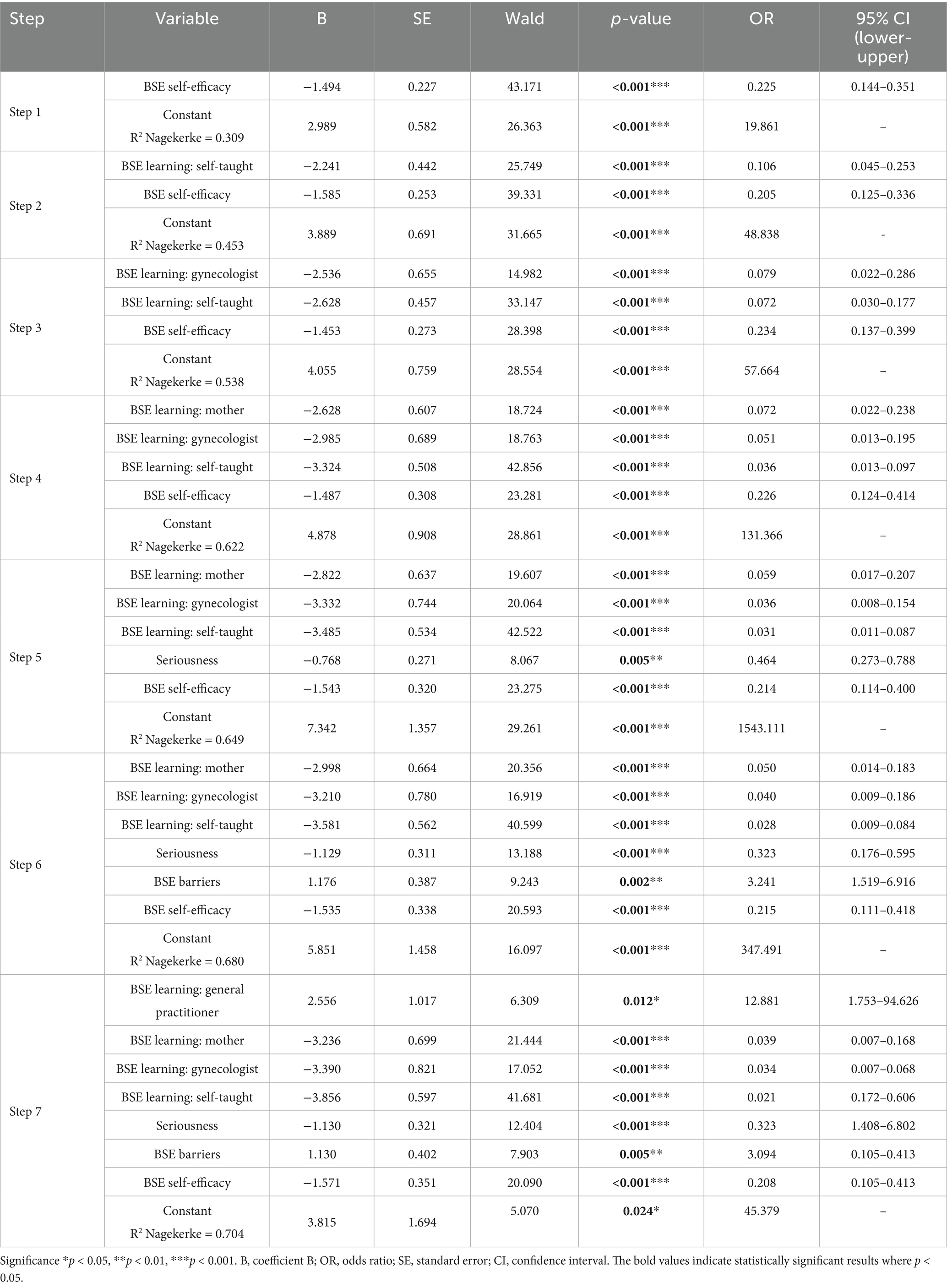 In Step 7, several methods of acquiring self-examination skills were significant predictors. Learning from the mother, receiving information from a gynecologist, and self-learning were also significant in the model, although their odds ratios were below 1, suggesting that their predictive value was weaker when considered alongside other sources of information. In contrast, information obtained from a general practitioner showed the strongest positive association, increasing the likelihood of regular practice more than twelvefold.