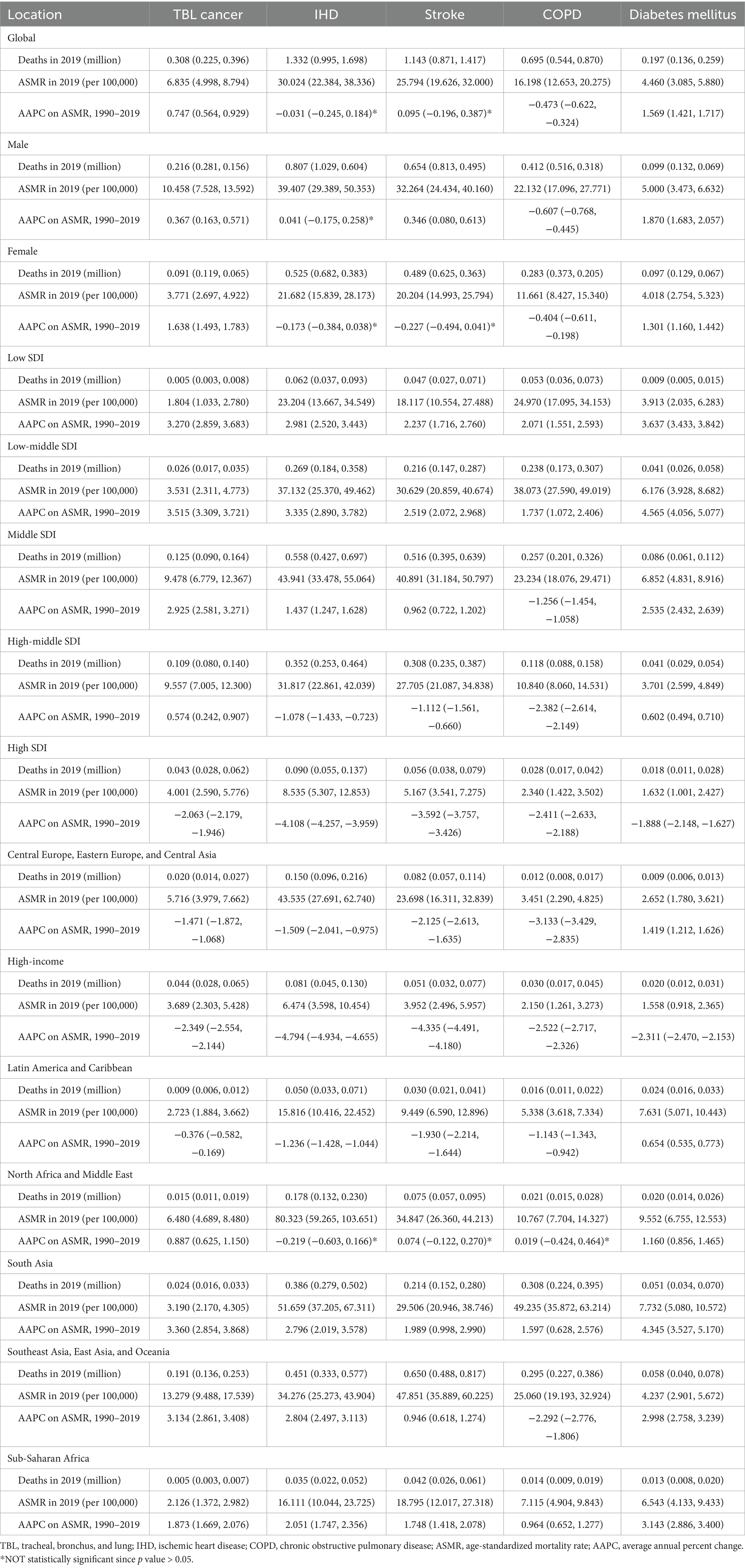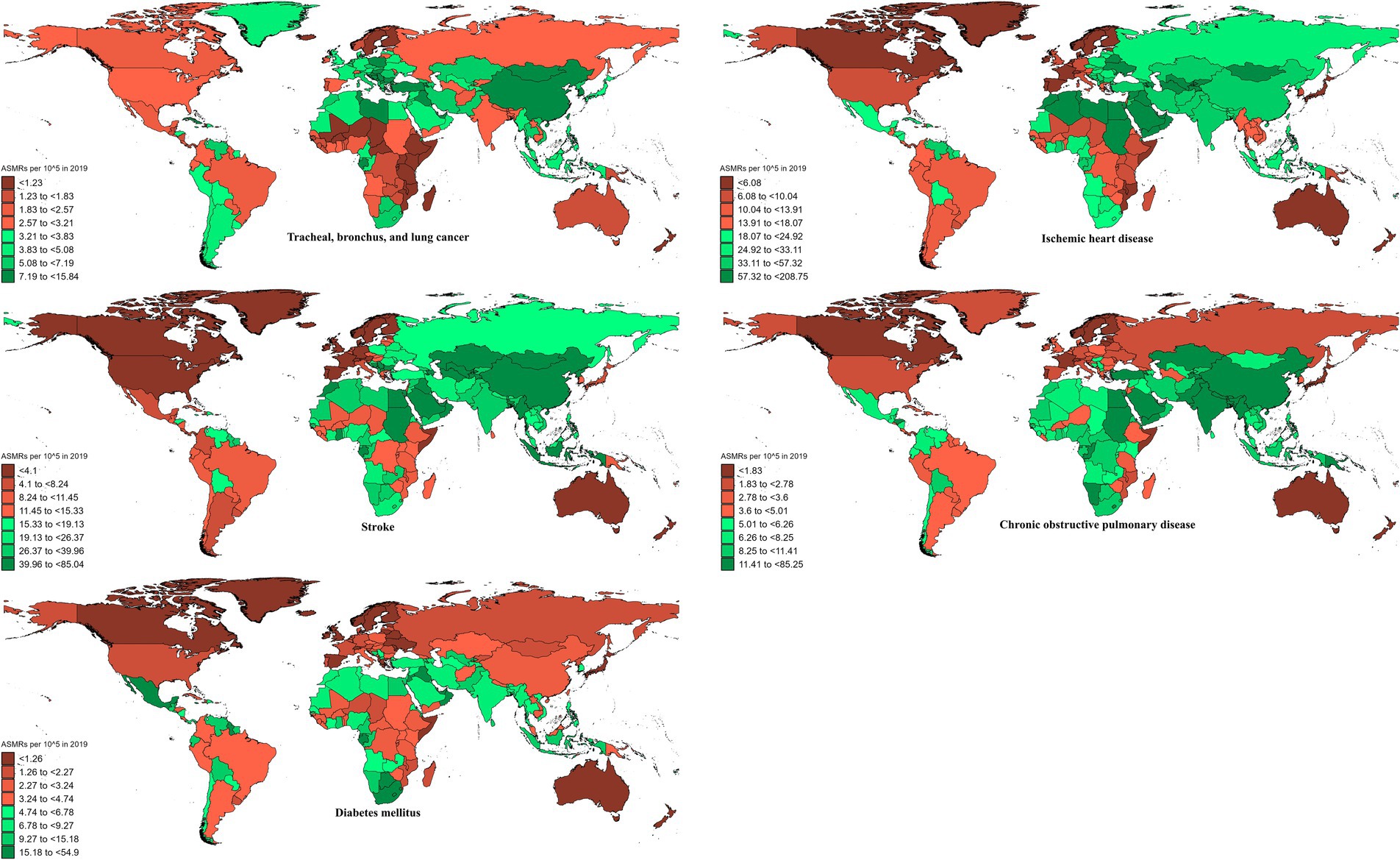 Previous literature has thoroughly analyzed the effects of ambient particulate pollution on the total disease burdens globally; however, integrative analyses that simultaneously contrast the attributable burden of multiple chronic non-communicable diseases while accounting for geographic variation remain critically underexplored (7–11). In response, this research systematically compared five representative chronic diseases attributable to particulate matter across regions using GBD 2019 data, aiming to deepen scientific insights and inform evidence-based interventions on the long-term health impacts of environmental exposures.