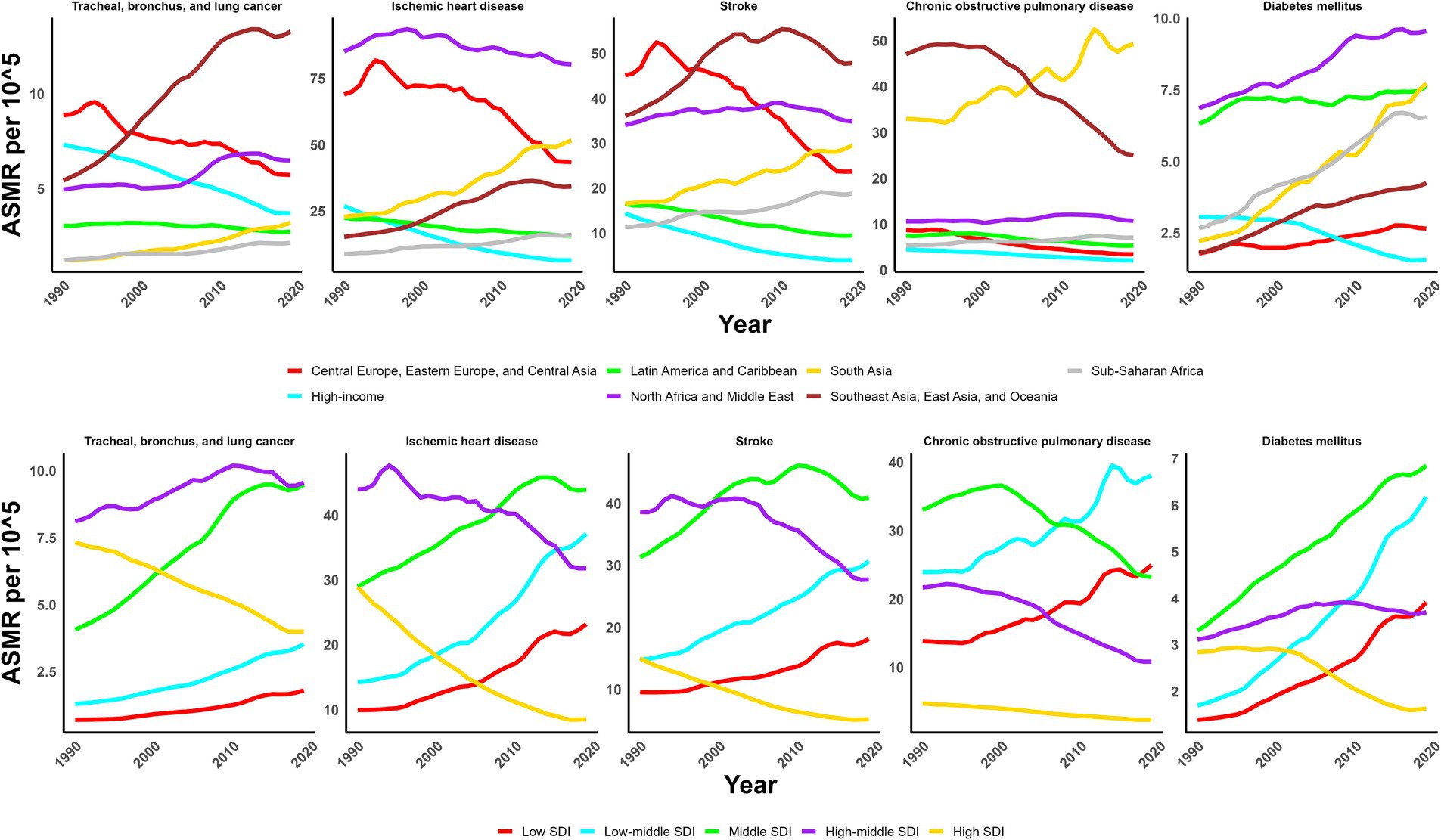 Methods: GBD 2019 data was used to assess age standardized rates of mortality (ASMR) and DALY (ASDR) from five chronic diseases due to ambient particulate matter from 1990 to 2019, focusing on temporal trends and cross-regional disparities using the Socio-demographic Index (SDI).