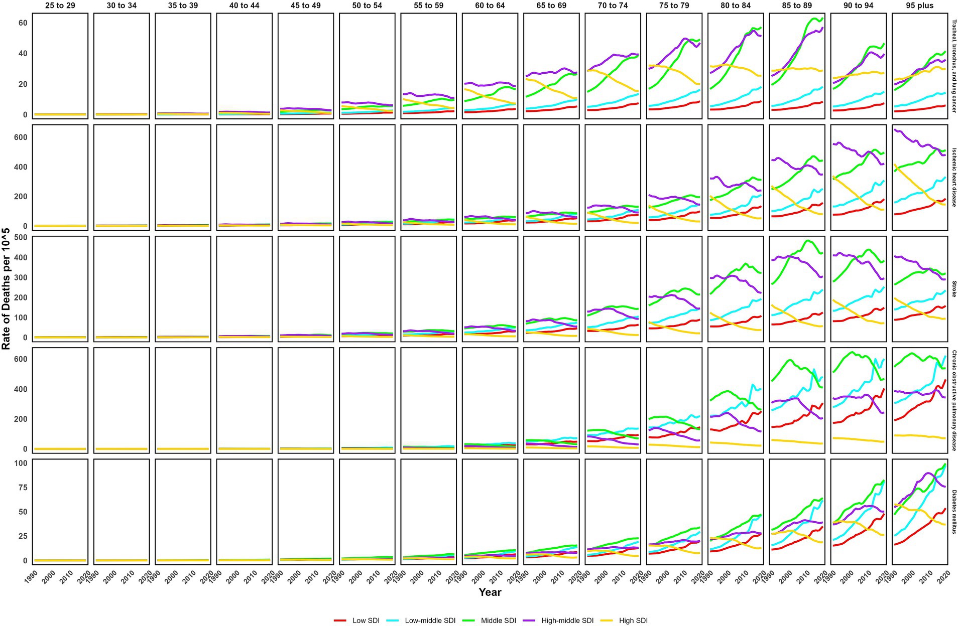 Figure 4. Trends of age-specific death rate of non-communicable diseases attributed to ambient particulate matter from 1990 to 2019.