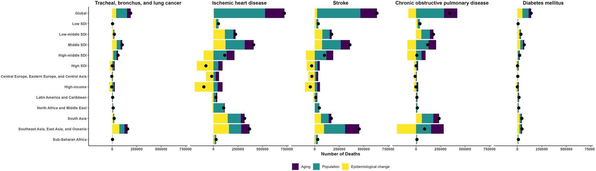 Between 1990 and 2019, population growth and aging largely drove the increases in deaths and DALYs for TBL cancer, IHD, stroke, COPD, and diabetes mellitus (Figure 5; Supplementary Figure S5; Supplementary Tables S4, S5). More precisely, for TBL cancer, population growth and aging accounted for 59 and 20% of the rise in deaths, and 66 and 18% of the increment in DALYs; for IHD, the corresponding contributions were 72 and 27% for deaths, and 71 and 18% for DALYs; for stroke, 70 and 27% for deaths, and 70 and 18% for DALYs; for COPD, 83 and 39% for deaths, and 86 and 30% for DALYs; and for diabetes, 45 and 19% for deaths, and 42 and 11% for DALYs.