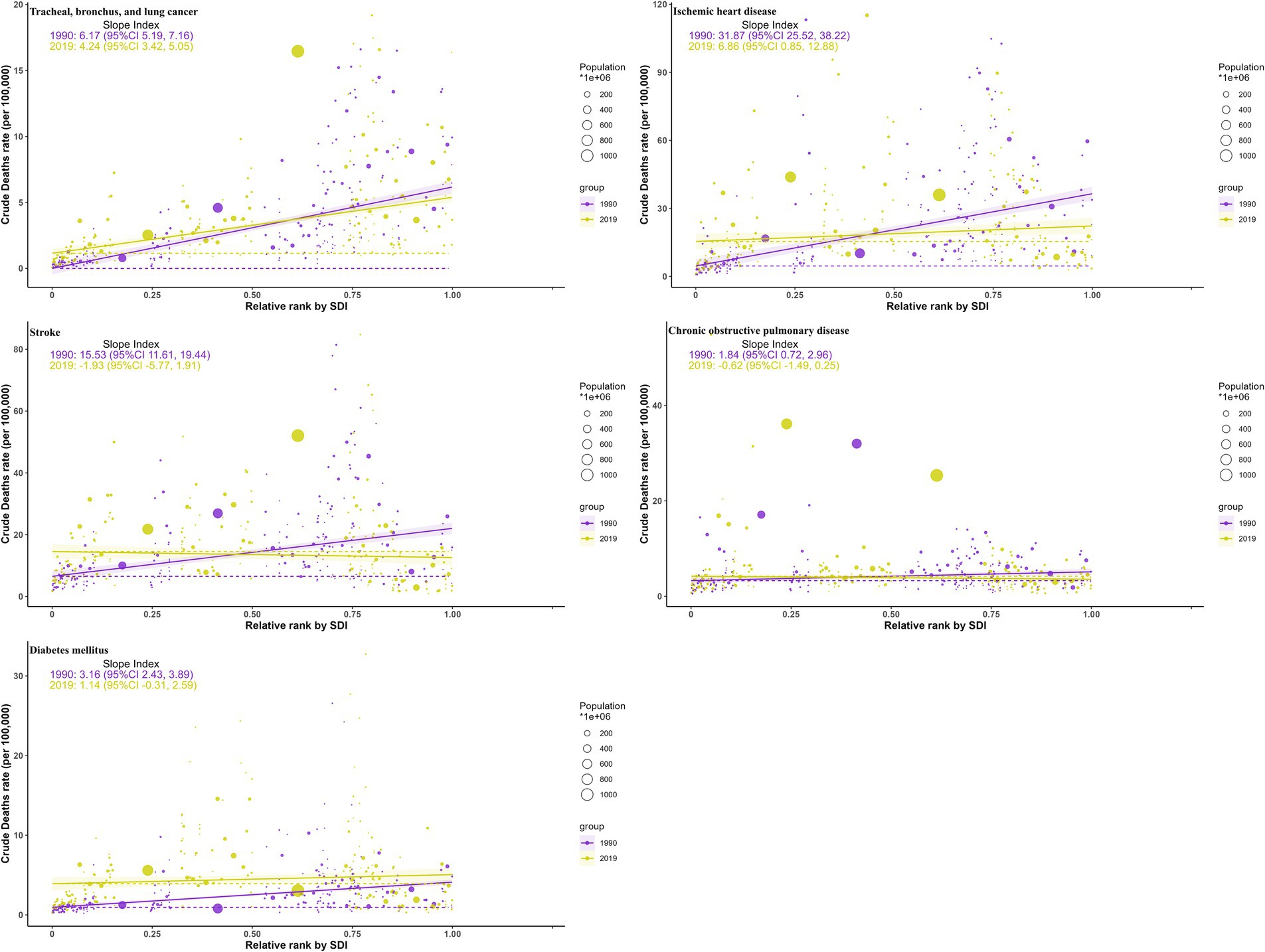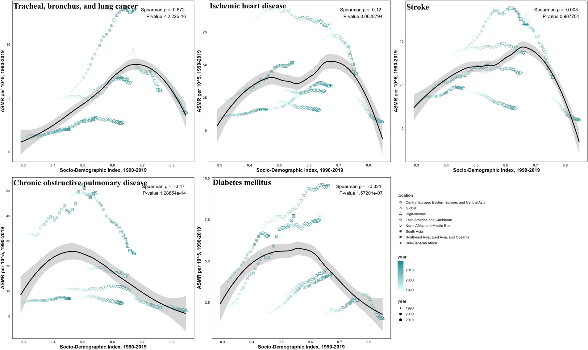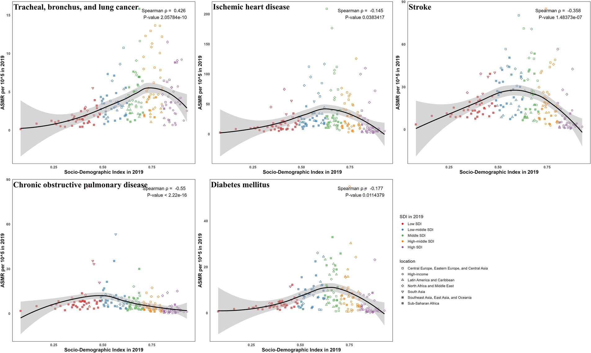 Correlations with SDI showed disease-specific disparities for ASMR (Figures 6, 7) and ASDR (Supplementary Figures S6, S7). For TBL cancer, both ASMR and ASDR had a significant positive correlation with SDI in 2019 (ρ = 0.43 and 0.40, respectively; p < 0.05), a trend that persisted from 1990 to 2019 (both ρ = 0.67; p < 0.05). In contrast, IHD exhibited a pronounced negative correlation in 2019 (ρ = −0.145 and −0.170, respectively; p < 0.05), though this pattern was not consistent over time. Stroke also demonstrated a negative correlation in 2019 (both ρ = −0.36; p < 0.05), which did not persist across past 30 years. For COPD, the negative correlation observed in 2019 (both ρ = −0.55; p < 0.05) was consistent with the long-term trend (ρ = −0.47 and −0.49, respectively; p < 0.05). Finally, for diabetes, only ASMR (ρ = −0.177; p < 0.05), not ASDR, was negatively correlated with SDI in 2019, continuing a trend evident since 1990 (ρ = −0.33; p < 0.05).