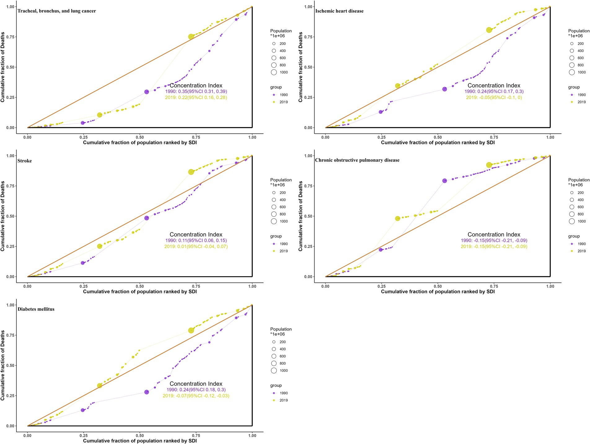 Figure 8. Health inequality curves for the deaths of ambient particulate matter-attributed non-communicable diseases from 1990 to 2019 across the world.