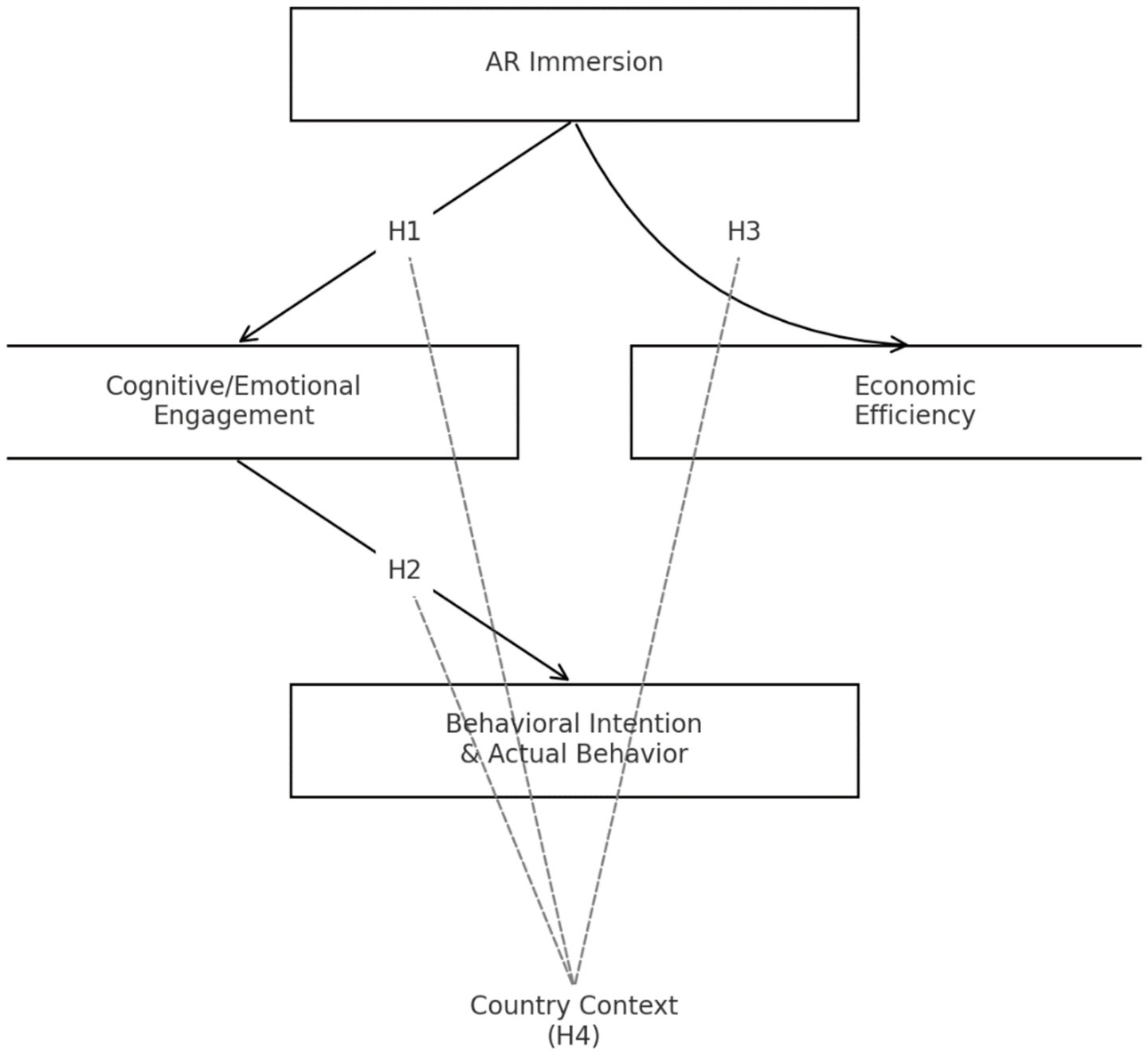 Drawing upon the reviewed literature and the pathways articulated in the conceptual framework—where AR immersion leads to cognitive/emotional engagement, which in turn drives behavioral intention and actual behavior, and where campaign cost relates to engagement gain and health outcome per dollar—and as illustrated in Figure 1, the following hypotheses were tested:
