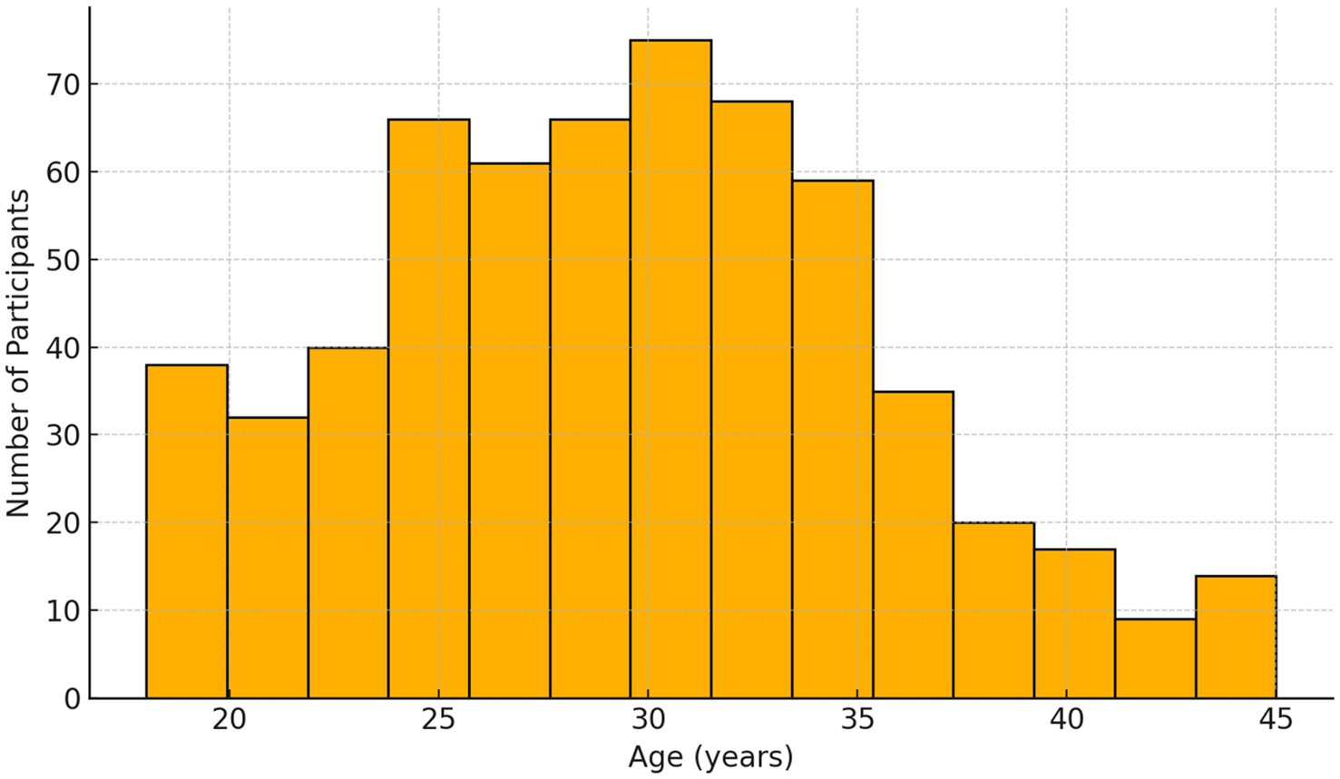 Figure 2 illustrates the frequency distribution of participant ages across the full sample. The histogram demonstrates a slight right skew, indicating a modest concentration of younger adults between 18 and 25 years, yet without extreme outliers. This pattern aligns with the target demographic for social-media–delivered interventions and supports the generalizability of engagement findings to a digitally active population.