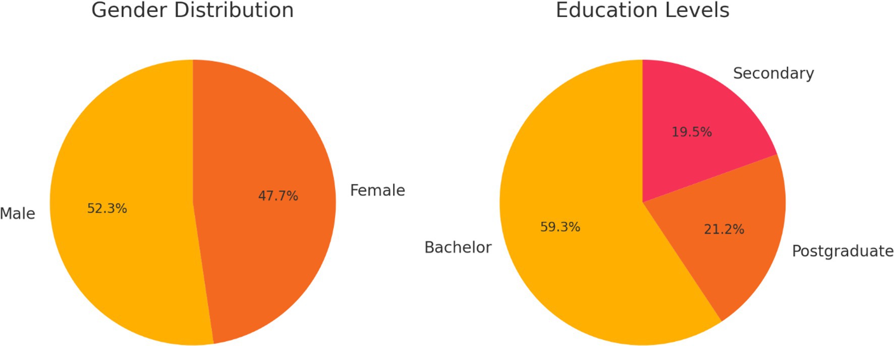 Figure 3 comprises two adjacent pie charts depicting the proportional breakdown of gender and educational attainment. The first chart confirms near parity between male and female respondents, while the second chart underscores the diversity of educational backgrounds, with undergraduate degrees representing the largest segment but postgraduate and secondary levels also meaningfully present. These visualizations reinforce the sample’s heterogeneity and attest to the robustness of subsequent between-group comparisons.