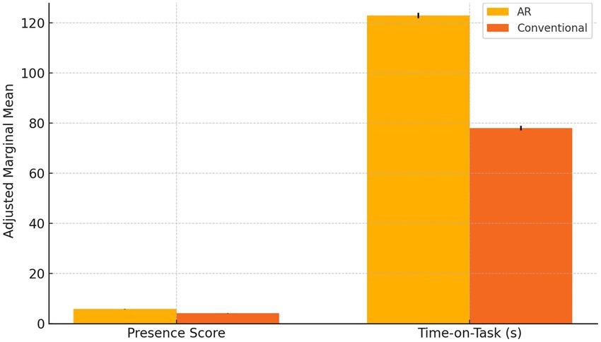 Figure 4 depicts the adjusted marginal means for presence and time-on-task across the two arms, with error bars representing ±1 standard error. Visually, the AR bars rise well above those of the conventional arm, offering an immediate illustration of the substantial engagement advantage conferred by immersive technology.