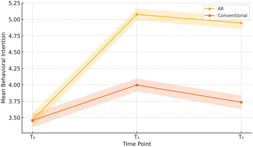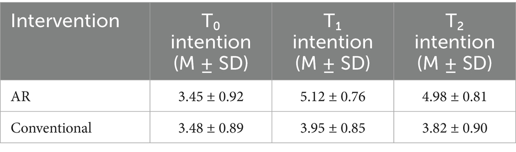 Table 5 displays the means and standard deviations for behavioral intention at T₀ (baseline), T₁ (immediate post-test), and T₂ (four-week follow-up) for each arm. The AR group’s intention score increased from 3.45 (SD = 0.92) at T₀ to 5.12 (SD = 0.76) at T₁ and stabilized at 4.98 (SD = 0.81) at T₂, whereas the conventional arm rose from 3.48 (SD = 0.89) to 3.95 (SD = 0.85) and 3.82 (SD = 0.90), respectively. These descriptive data suggest both an immediate and sustained boost in intention within the AR condition.