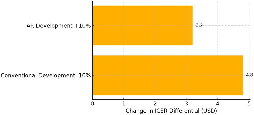 Figure 6 depicts a tornado diagram that ranks cost inputs by their impact on the ICER differential. The length of each bar conveys the degree to which a ± 10% change in that cost element would alter the incremental cost-effectiveness of AR over conventional media. Development costs emerge as the most influential factor, yet even maximal variance along this dimension fails to eliminate AR’s cost-effectiveness lead.