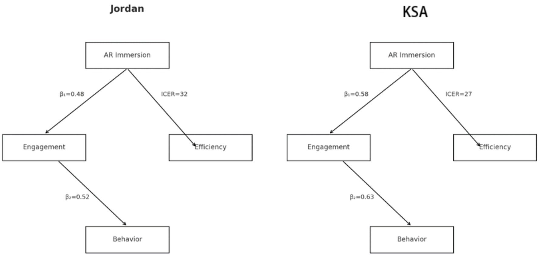 Figure 7 offers two simplified conceptual diagrams—one for Jordan and one for the Saudi Arabia—each annotated with the corresponding β values for H₁, H₂, and the ICER value for H₃. The Jordan diagram illustrates moderate path strengths (β₁ = 0.48; β₂ = 0.52; ICER_Jordan = 32), whereas the Saudi Arabia diagram highlights stronger paths (β₁ = 0.58; β₂ = 0.63; ICER_ Saudi Arabia = 27). This visual juxtaposition crystallizes the differential performance of AR campaigns: while both contexts benefit from immersive media, the Saudi Arabia higher baseline digital literacy and infrastructural support amplify AR’s behavioral and economic impact.