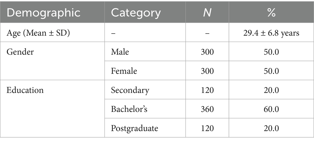 Table 1 presents the frequencies and percentages for gender and educational attainment, alongside the mean age and standard deviation for the overall sample. Examination of these metrics reveals a balanced gender composition, with male and female participants each constituting approximately half of the cohort. The mean age of 29.4 years (SD = 6.8) indicates a predominantly young adult sample, consistent across both national contexts. Moreover, education levels—ranging from secondary to postgraduate degrees—are distributed evenly, thereby mitigating concerns about confounding effects related to participants’ educational background.