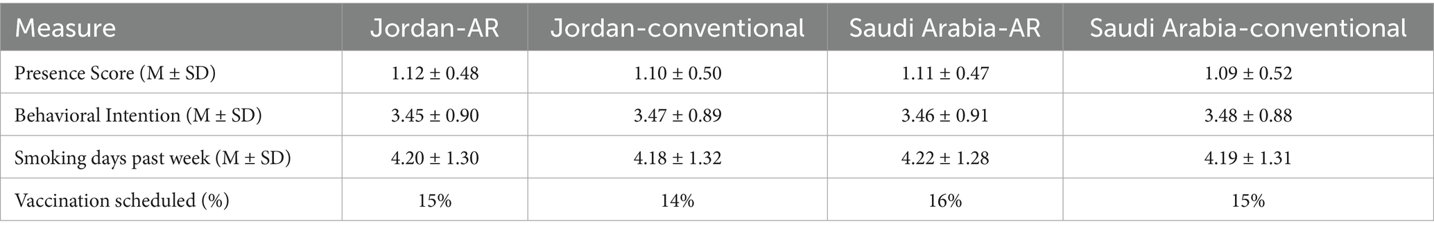 Never before in history did digital innovation and population outreach related to public health ever converge in the way it has done in the 21st century and this has seen a paradigm shift in how populations read, interpret and react to important health information (1). In the context of this change, augmented reality (AR) has been discovered as an effective mechanism to engage learners in learning complicated biomedical ideas in the form of immersive and richly contextualized visualizations to provide a better learning experience and development of understanding. Notwithstanding its potential, the uptake of AR in the mass-communication health campaign is in its infancy period, especially in the Middle East and North Africa (MENA) region, where economic and cultural factors may moderate the adoption, as well the efficacy, of AR. The health-media communication landscape has been totally transformed by high rates of digitalization, which is emphasizing the transformation of one-way and static, passive information dissemination to a more dynamic and user focused interaction. The traditional broadcast and print channels, though they are fundamental have the drawback because they cannot be personalized and cannot facilitate real-time feedback and, therefore, the effects they have on rigid health habits are limited. On the contrary, AR extends the same process by introducing virtual principles to the real-life spaces of users to provide the so-called presence, an immersive performance that is cognitive and emotional engagement superior to that of two-dimensional display sources (2). The efficacy of AR in medical training, surgical assistance, and patient education is proven by experimental works: Barsom et al. (3) demonstrated that including AR simulation in the learning process led to a better improvement in the learning progress, and that Moro et al. (4) revealed a higher retention of anatomy when using AR overlays. Overall, these findings lead to the suggestion that AR may replace the conventional pedagogies and be used as a groundbreaking tool in health awareness programs (4–6). Although success of AR has been reported in controlled educational and professional clinical settings, it does not extend well into mass communication pointed health campaign. Traditional campaigns which anchor mostly on posters, videos, and didactic communications often fail to create lasting change in behavior, especially in certain groups of people who may have a die-hard loyalty or lack interest. Indeed, studies highlight a persistent “intention-behavior gap,” wherein favorable attitudes toward health recommendations fail to manifest as concrete actions (7). Moreover, while AR affords immersive engagement, scant research has systematically evaluated its cost-effectiveness relative to standard media formats, especially within MENA countries characterized by variable technology infrastructure and diverse cultural attitudes toward digital interventions. Consequently, there exists a critical lacuna in evidence regarding whether the incremental investments in AR development and distribution yield proportional gains in health outcomes and economic efficiency (8, 9). This is what this research has proceeded to intense search of comparative behavioral and economical impact of AR-enriched and conventional media campaign within Jordan and Saudi Arabia, attempting to bridge the gaps between presence theoretical process and desired behavioral signal and actual cost effectiveness indicators (2, 7). To ground the intervention in a robust theoretical framework, this study integrates three complementary perspectives. First, the Theory of Planned Behavior (7) provides a foundation for explaining how attitudes, subjective norms, and perceived behavioral control jointly shape behavioral intentions, which then predict health actions across diverse contexts. Second, the concept of presence in immersive environments (2) underscores how augmented reality (AR) heightens the sense of “being there,” thereby strengthening cognitive elaboration and emotional resonance. Immersion is demonstrated to support the retention and acquisition of skills, as evidenced by the empirical studies of medical training in Europe (3) and anatomy training in Australia (4), which are the same objectives as those of public-health campaigns. Lastly, behavioral economics and nudge theory can help us understand that making small adjustments to the decision environment can influence health decisions without forcing them (10). Plausible examples include their application in Sweden in enhancing the use of vaccination (11) and the United States in reducing smoking (12). Combined, these frameworks explain the processes by which AR will be supposed to increase engagement, intention, and eventually encourage healthier behaviors both in the Middle East and globally. When determining the focal health behaviors, the study combined the smoking cessation and influenza vaccination to represent two different and yet complementary areas of public health. Smoking cessation reflects an avoidance-oriented behavior aimed at reducing harm, whereas vaccination embodies an adoption-oriented behavior that promotes proactive protection (13, 14). Both behaviors share a common theoretical pathway, requiring the translation of intention into action, as articulated by the Theory of Planned Behavior (7) and supported by meta-analytic evidence on health behavior change (15). Including these behaviors within a single study enabled the evaluation of whether AR interventions are effective across divergent types of health decision-making, thereby enhancing the generalizability of findings. Furthermore, in the regional context of Jordan and the Saudi Arabia, public-health campaigns often integrate anti-smoking messages and vaccination promotion into unified awareness programs, making their joint examination both theoretically justified and practically relevant. Therefore, The principal a
