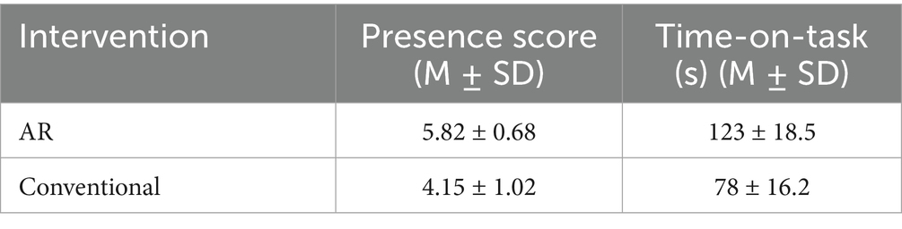 Table 3 summarizes the mean presence scores and time-on-task for each intervention arm. Notably, the AR group achieved a mean presence score of 5.82 (SD = 0.68), compared to 4.15 (SD = 1.02) in the conventional arm, signifying a pronounced enhancement in immersive experience. In parallel, the AR condition recorded an average engagement duration of 123 s (SD = 18.5), markedly exceeding the 78 s (SD = 16.2) observed in the conventional group. These differences underscore the potency of AR modalities in capturing and sustaining user attention.
