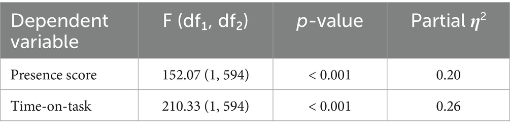 Prior to hypothesis testing, Levene’s tests confirmed homogeneity of variances for both presence [F(1,598) = 1.24, p = 0.266] and time-on-task [F(1,598) = 0.89, p = 0.346], satisfying key ANCOVA assumptions (Table 4).