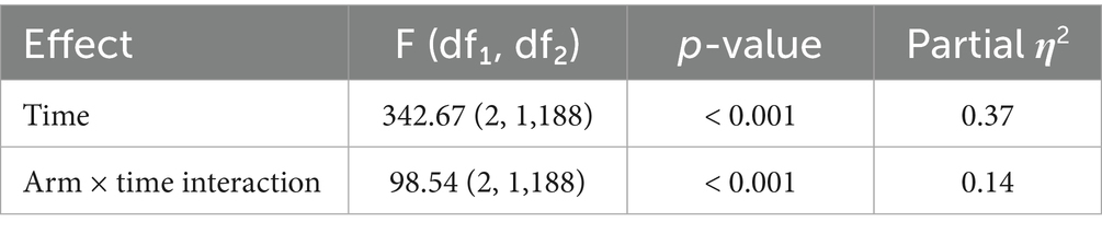 Building on this descriptive foundation, a 2 × 3 mixed-design ANCOVA was conducted to disentangle the effects of intervention arm and time, controlling for age and gender covariates.