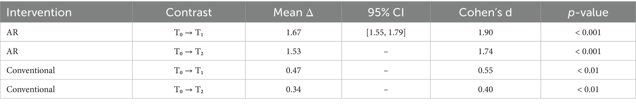 Table 7 reports mean differences, 95% confidence intervals, and Cohen’s d for the T₀ → T₁ and T₀ → T₂ contrasts within each arm. In the AR arm, the T₀ → T₁ contrast yielded a mean increase of 1.67 points (95% CI [1.55, 1.79], d = 1.90, p < 0.001), while the T₀ → T₂ effect remained robust (mean Δ = 1.53, d = 1.74, p < 0.001). Conversely, the conventional arm exhibited smaller effects (T₀ → T₁: Δ = 0.47, d = 0.55; T₀ → T₂: Δ = 0.34, d = 0.40), albeit significant at p < 0.01. These findings confirm that AR engenders both larger and more durable intention shifts.