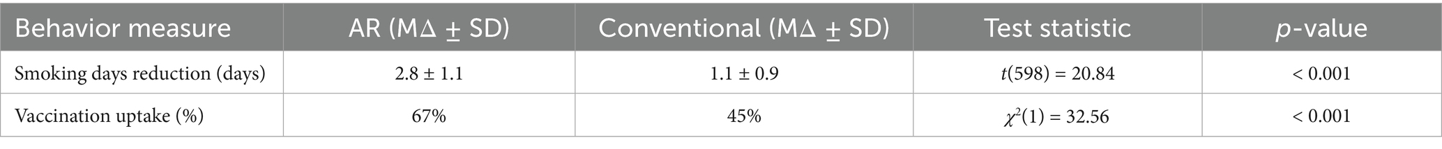 Table 8 contrasts mean reductions in weekly smoking days and the proportion of participants scheduling influenza vaccinations at T₂. An independent-samples t-test indicated a significantly greater reduction in smoking frequency in the AR arm (MΔ = 2.8 days, SD = 1.1) compared to the conventional arm [MΔ = 1.1 days, SD = 0.9; t(598) = 20.84, p < 0.001], and a χ2 test revealed a substantially higher vaccination uptake rate among AR participants (67%) versus controls [45%; χ2(1) = 32.56, p < 0.001]. These robust behavioral outcomes corroborate the premise that heightened intention, as catalyzed by AR immersion, effectively translates into tangible health actions.