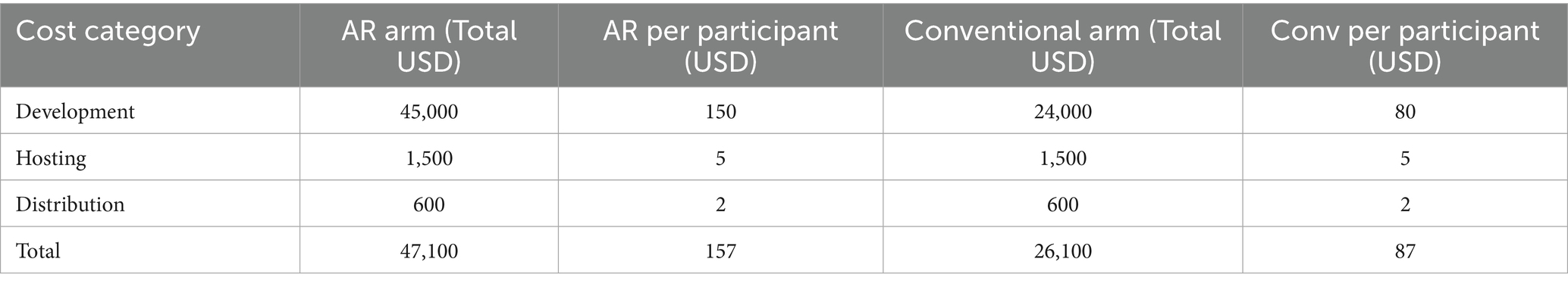 Nevertheless, a subset of investigations has begun to quantify AR’s economic footprint. For instance, a comprehensive review of mobile AR health education programs estimated development and distribution costs per user, revealing that AR interventions could achieve comparable or superior outcomes at marginally higher costs than conventional media, with ICERs falling within acceptable thresholds for preventive programs (24). These findings suggest that, although initial production expenditures for AR content are elevated, the scalable nature of web-AR platforms and potential for repeated use may amortize costs over large audiences, thus enhancing economic efficiency in the medium to long term.