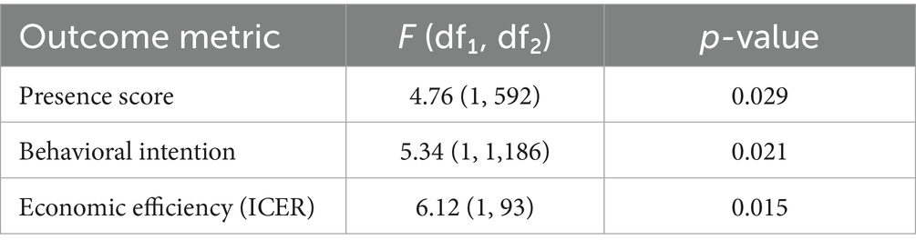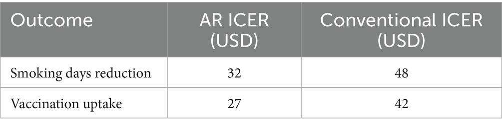 A rigorous economic evaluation was conducted to ascertain whether the immersive AR intervention delivered superior “behavior change per dollar” compared to the conventional campaign. This assessment combined detailed cost accounting with measured behavioral outcomes, thereby generating an incremental cost-effectiveness ratio (ICER) that encapsulates the additional cost required to achieve one unit of behavior change via AR relative to standard media. Such analyses are indispensable in public-health decision-making, as they translate abstract engagement and intention gains into concrete economic terms (8, 23).