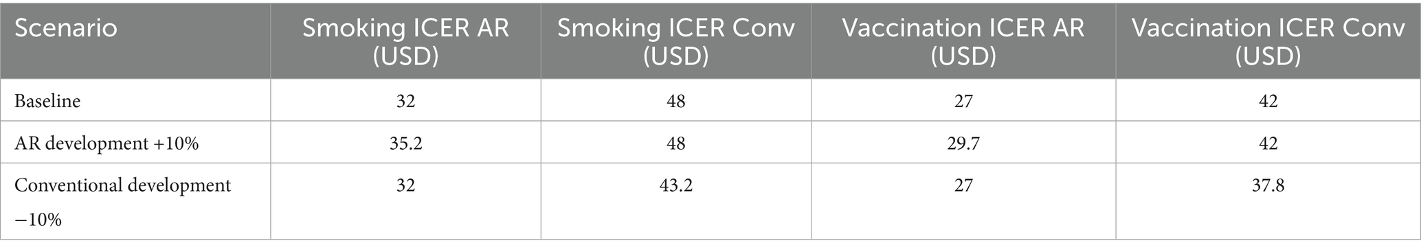 Table 10 reports the base-case ICER values for both smoking reduction and vaccination uptake. In each instance, the AR arm achieved behavior changes at a lower incremental cost than the conventional arm. For example, the additional cost per unit reduction in weekly smoking days was estimated at USD 32 for AR versus USD 48 for conventional media, while the cost per additional vaccination scheduled stood at USD 27 for AR compared to USD 42 for the standard campaign. These findings substantiate Hypothesis 3, demonstrating that the immersive modality yields a more favorable return on investment in terms of public-health outcomes.