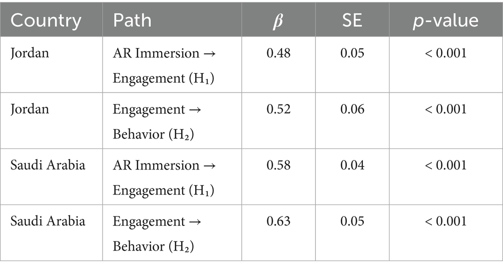 Table 12 presents the estimated standardized β coefficients, standard errors, and p-values for the paths AR Immersion → Engagement (H₁) and Engagement → Behavioral Intention and Actual Behavior (H₂) within each national sample. In Jordan, the AR → Engagement path yielded β = 0.48 (SE = 0.05, p < 0.001), while the Engagement→Behavior path was β = 0.52 (SE = 0.06, p < 0.001). By contrast, the Saudi Arabia sample demonstrated stronger coefficients—β = 0.58 (SE = 0.04, p < 0.001) for H₁ and β = 0.63 (SE = 0.05, p < 0.001) for H₂—indicating a more pronounced effect of AR immersion on cognitive/emotional engagement and of engagement on intention and behavior. These discrepancies in magnitude underscore the differential receptivity to immersive stimuli across the two contexts, with Emirati participants exhibiting greater sensitivity to AR-driven experiential input.