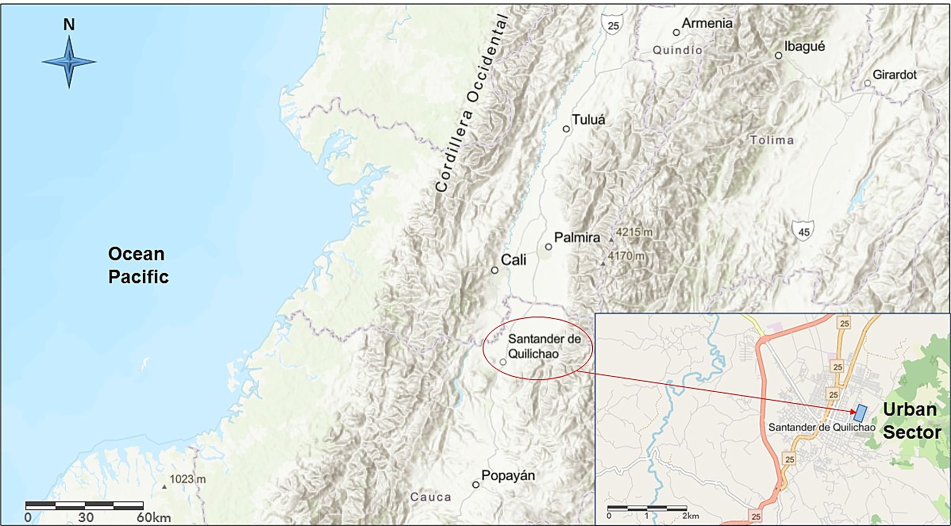 Figure 1. Location of the study area in Santander de Quilichao, Department of Cauca, southwestern Colombia. The study area is identified (blue rectangle).