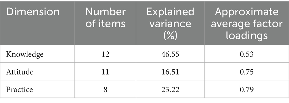Cronbach’s alpha coefficients for the knowledge, attitude, and practice scales were 0.70, 0.75, and 0.79, respectively, indicating acceptable to good internal consistency. An exploratory factor analysis (EFA) was performed on the CAP scale items to evaluate their underlying factor structure and the construct validity of the instrument. A Varimax rotation analysis was applied in order to identify the three factor dimensions that constitute the instrument. The analysis yielded a three-factor solution that explained 86.27% of the total variance. Please refer to Table 1, which presents the factor loadings grouped according to the CAP dimensions. The knowledge dimension grouped 12 items and explained 46.55% of the variance, with average factor loadings around 0.53, indicating an adequate association between the items and that dimension. The attitude dimension, which comprises 11 items, contributed 16.51% of the variance and had an average factor loading close to 0.75, reflecting a strong relationship between the items and this factor. The practice dimension, consisting of eight items, explained 23.22% of the total variance and showed the highest average factor loadings (0.79), evidencing a strong link between preventive measures and this dimension. All items exhibited clear and interpretable factor loadings, consistent with their theoretical assignment. Following the analysis, no items were excluded or modified, indicating stable psychometric properties and robust construct validity.