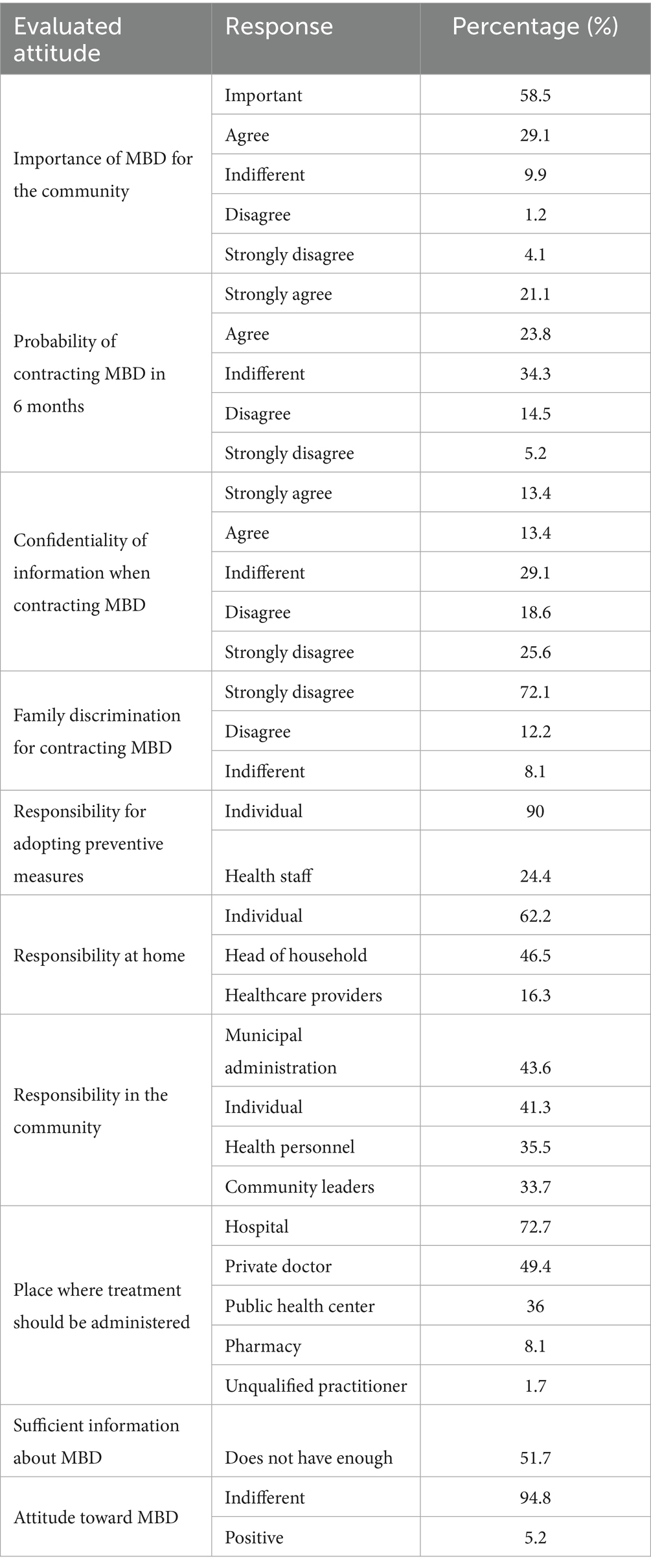 The majority of interviewees (58.5%) responded that MBD are an important problem for the community, 29.1% was agreed, 9.9% were indifferent, 1.2% disagreed and 4.1% totally disagreed. The probability of contracting a MBD in the next six-month, were as follows: 21.1% expressed a strong agreement, 23.8% indicated an agreement, 34.3% remained indifferent, 14.5% expressed disagreement, and 5.2% strongly disagreed. In the moment to contract a MBD, 13.4% were strongly agreed that the information should remain confidential, 13.4% agreed, 29.1% were indifferent, 18.6% disagreed, and 25.6% strongly disagreed. In cases of family could be discriminated for contracting MBD, they responded that 72.1% strongly disagreed, 12.2% disagreed, and 8.1% were indifferent. 90% considered that the responsibility of each individual to adopt preventive measures to avoid MBD, followed by health staff (24.4%). At home, the responsibility is personal (62.2%), or head of household (46.5%) and healthcare providers (16.3%). The responsibility in the community is to, municipal administration (43.6%), personal responsibility (41.3%), health personnel (35.5%) and community leaders (33.7%). The question about the effective treatment of individuals infected with MBD, showed that the treatment should be administered in a hospital (72.7%), by a private doctor (49.4%), in a public health center (36%), in a pharmacy (8.1%) or by an unqualified practitioner (1.7%). It was evident that 51.7% of the participants did not have enough information about MBD. The 94.8% displayed an indifferent attitude, while 5.2% showed a positive attitude (Table 3).