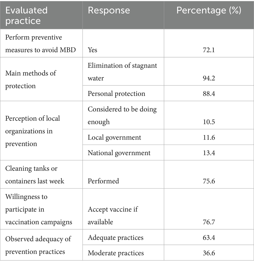 A total of 72.1% of participants carried out preventive measure to avoid contracting MBD. The main methods of protection were (a) Elimination of stagnant water: 94.2% considered that eliminating all types of stagnant water reduce the mosquito populations, (b) Personal protection: 88.4% protecting themselves from MBD. 10.5% of participants considered that local organizations were doing enough to prevent MBD, represented by local government (11.6%) and national government (13.4%). 75.6% reported cleaning tanks, storage containers or stagnant water the last week. This behavior is crucial in reducing potential breeding sites for mosquito and reflects a commitment to maintaining a healthier environment. The survey showed a strong willingness among participants to participate in vaccination campaigns against MBD, 76.7% accepting a vaccine if is available. Adequate practices for the prevention of MBD were observed in 63.4% of participants, whereas 36.6% had moderate practices (Table 4).