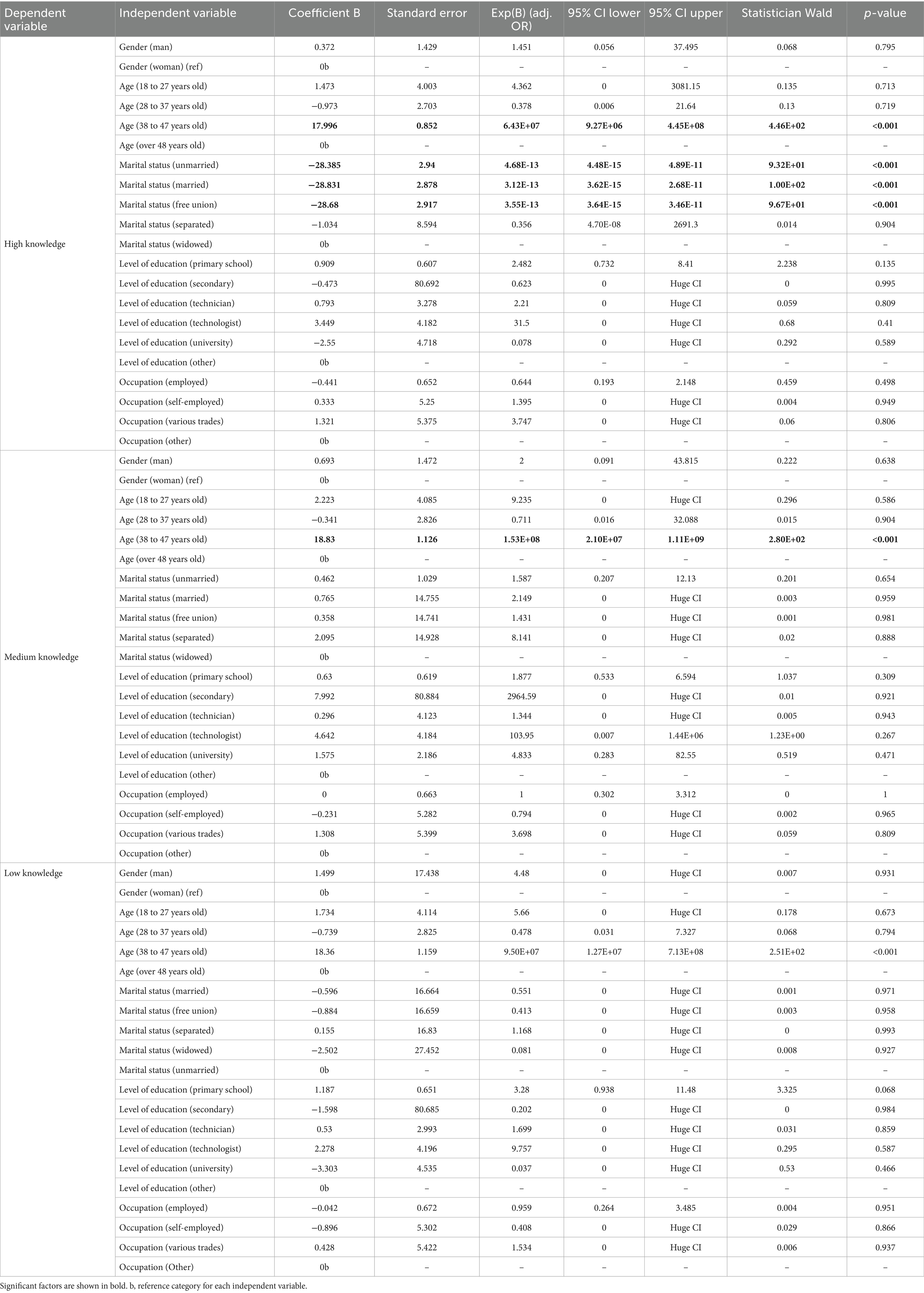 In order to analyze the relationship between sociodemographic variables and knowledge levels, we employed a multinomial logistic regression model. The knowledge index, categorized into five levels, served as the dependent variable, with the lowest category used as the reference. All independent variables were included simultaneously in the model, including gender, age, marital status, education, occupation, income, number of dependents, presence of reproductive women, and pregnant women in the household. This approach enables the estimation of the effect of each predictor on the odds of belonging to each knowledge category relative to the reference. The same set of variables was applied across all outcome categories, ensuring the comparability and interpretability of the associations. The regression model was built using gender, age, marital status, education and occupation as independent variables. These factors have been consistently identified in the literature as the most robust and theoretically relevant predictors of knowledge, attitudes and practices regarding MBD (c, 39, 51). Other registered variables were not included in the model because they did not demonstrate sufficient variability or statistical association in preliminary analyses.