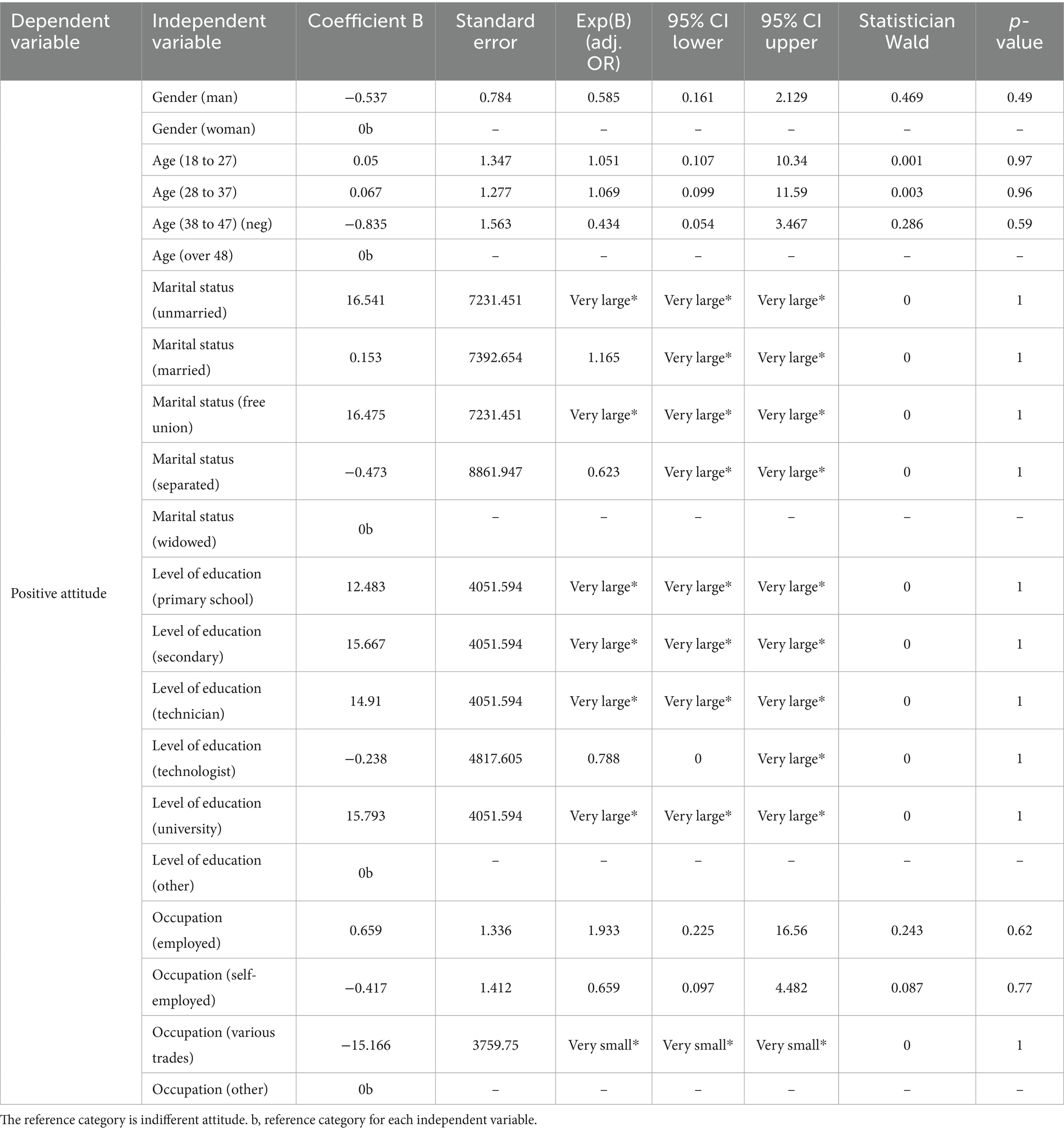 Table 6. Multinomial logical regression analysis of sociodemographic factors associated with attitude about MBD in a local area from Santander de Quilichao, Colombia.