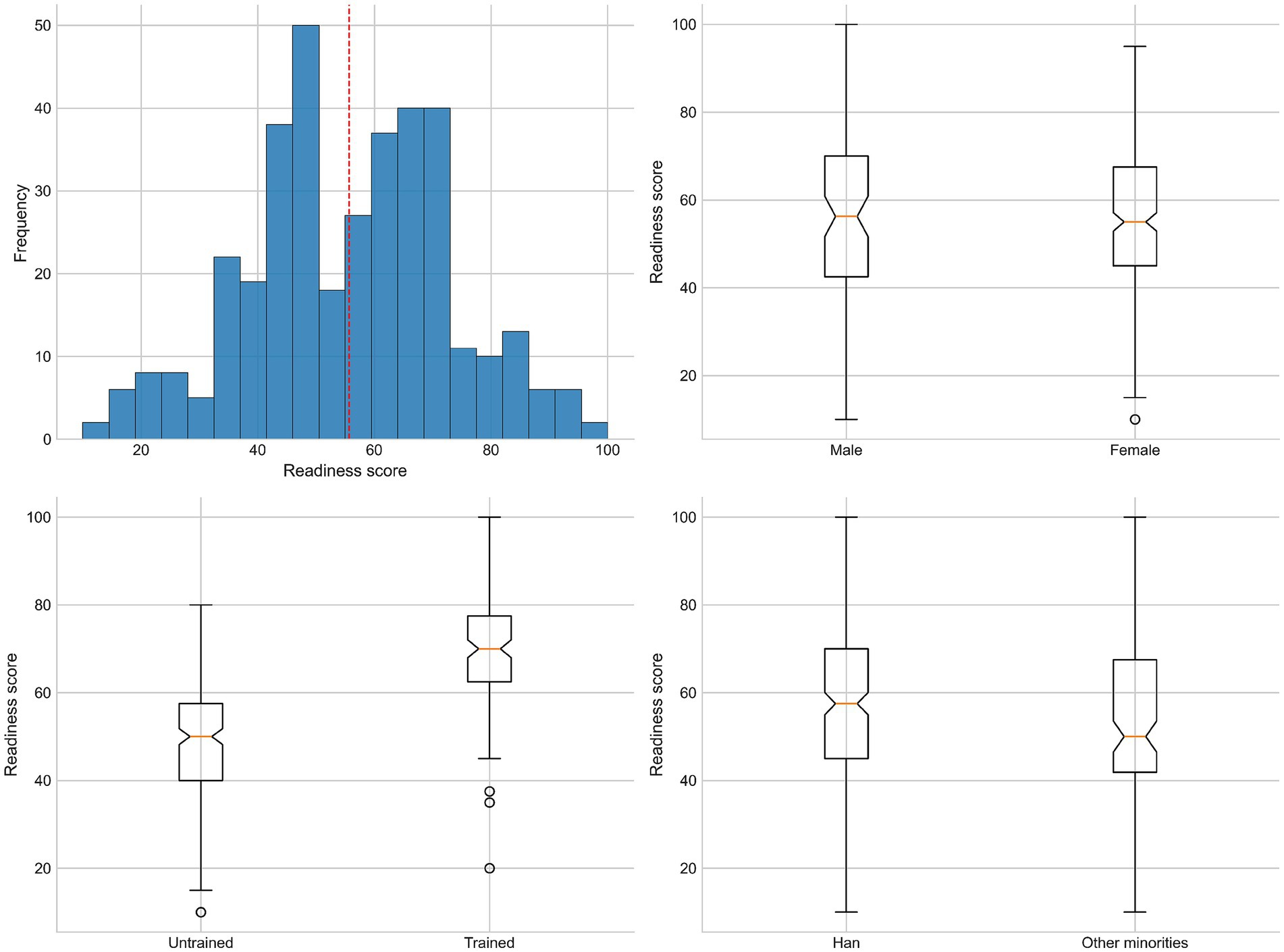 Figure 1. Statistical analysis of CPR readiness scores. Overall distribution (histogram) and group comparisons by gender, training status, and ethnicity.