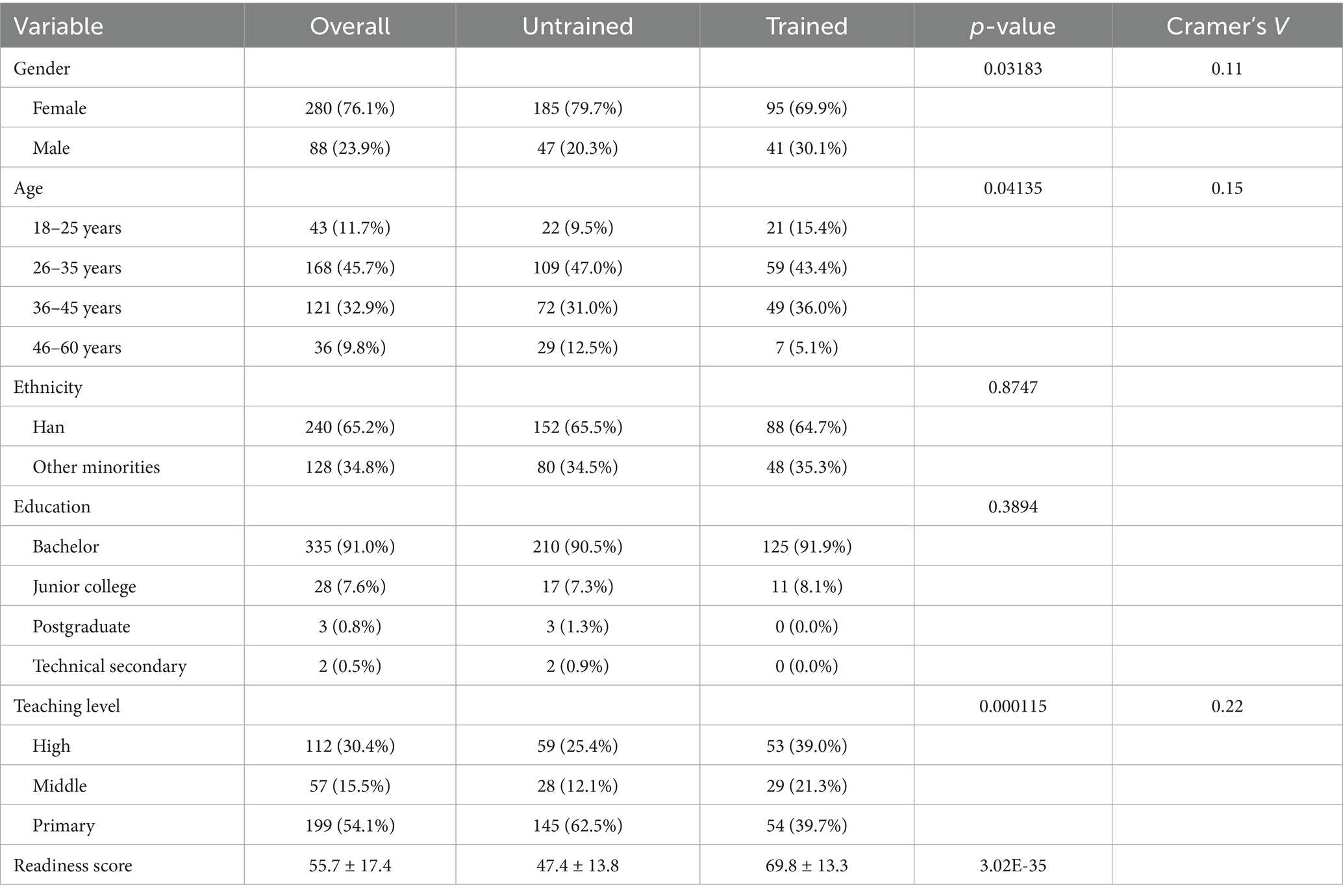 Among 368 teachers, 280 (76.1%) were female and 88 (23.9%) male (Table 1). Age distribution was 18–25 years 11.7%, 26–35 years 45.7%, 36–45 years 32.9%, and 46–60 years 9.8%. Ethnicity was Han 65.2% and other minorities 34.8%. Most held a bachelor’s degree (91.0%). Teaching levels were primary 54.1%, high 30.4%, and middle 15.5%. Overall, 37.0% were trained (self-study or formal).