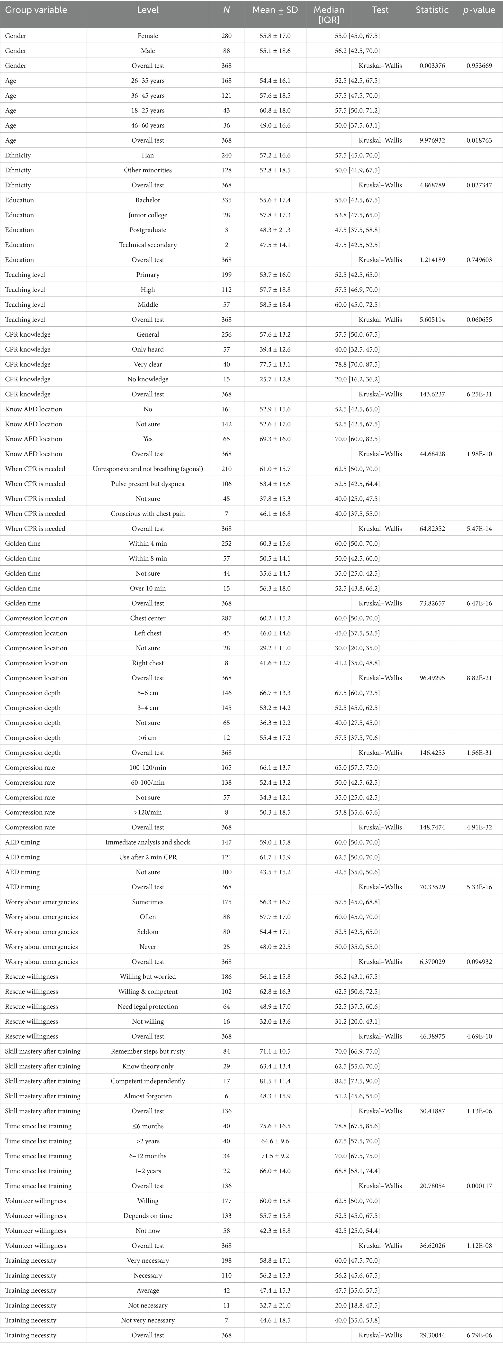 Overall CPR training rate was 37.0%, comprising 10.9% formal training through hospitals or Red Cross organizations and 26.8% self-study through videos or books (Supplementary Table 1). Among trained individuals (n = 136), training recency varied: within 6 months (29.4%), 6–12 months (25.0%), 1–2 years (16.2%), and over 2 years (29.4%). Skill retention among trained personnel was suboptimal: 12.5% felt capable of independent operation, 61.8% remembered steps but felt rusty, 21.3% retained only theoretical knowledge, and 4.4% had almost forgotten their training. Training status varied by gender (p = 0.032, Cramer’s V = 0.11), age (p = 0.041, Cramer’s V = 0.15), and teaching level (p < 0.001, Cramer’s V = 0.22), but not by ethnicity or education level.