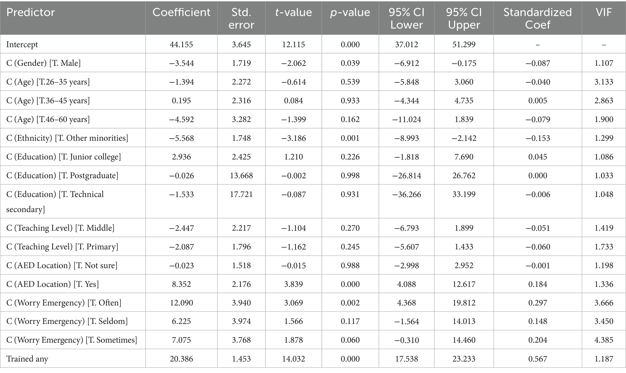 In the OLS model with robust (HC3) standard errors (adjusted R2 = 0.49), independent positive correlates of readiness were training (any vs. none: +20.39 points [95% CI: 17.54–23.23], standardized β = 0.57; p < 0.0001), AED location awareness (Yes vs. No: +8.35 [4.09–12.62], standardized β = 0.18; p = 0.000124), and often worrying about emergencies (Yes vs. never: +12.09 [4.37–19.81], standardized β = 0.30; p = 0.00215). Male gender (−3.54 [REVISED] [−6.91 to −0.18], standardized β = −0.09; p = 0.039) and other minority ethnicity (−5.57 [−8.99 to −2.14], standardized β = −0.15; p = 0.00145) were independently associated with lower readiness (Table 3 and Supplementary Figure 1). Age group, education, teaching level, and being “not sure” about AED location were not significant after adjustment. Variance inflation factors ranged from 1.03 to 4.39, all below the threshold of 5.0, indicating acceptable levels of multicollinearity. Stratified analyses showed that the positive effect of AED awareness persisted even among untrained teachers (+8.63 points, p = 0.023), suggesting independent contributions beyond training effects.