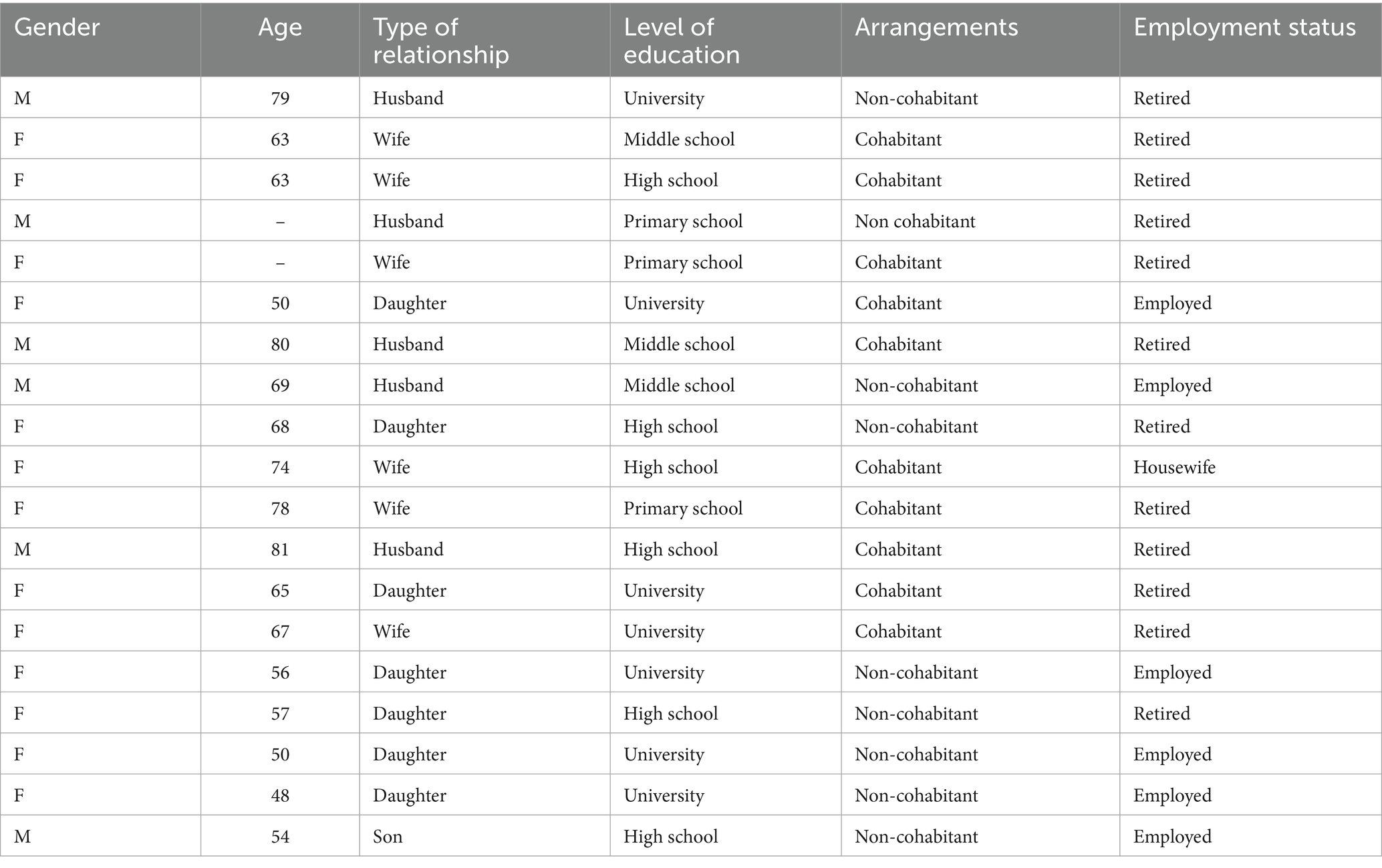 Socio-demographic information was collected prior to the start of each focus group and included: gender, age, relationship to the care-receiver, level of education, arrangements, and employment status. The overall sample (n = 19) was composed of adult children of the person with dementia (n = 8), wives caring for their husbands with dementia (n = 6), and husbands caring for their wives with dementia (n = 5). The average age of participants was 65 years, ranging from 48 to 81 years. The most commonly reported level of education was completion of a university degree (n = 7), followed by high school (n = 6), middle school (n = 3), and primary school (n = 3). Most participants (n = 10) lived with the person they cared for. Detailed socio-demographic characteristics are presented in Table 2.