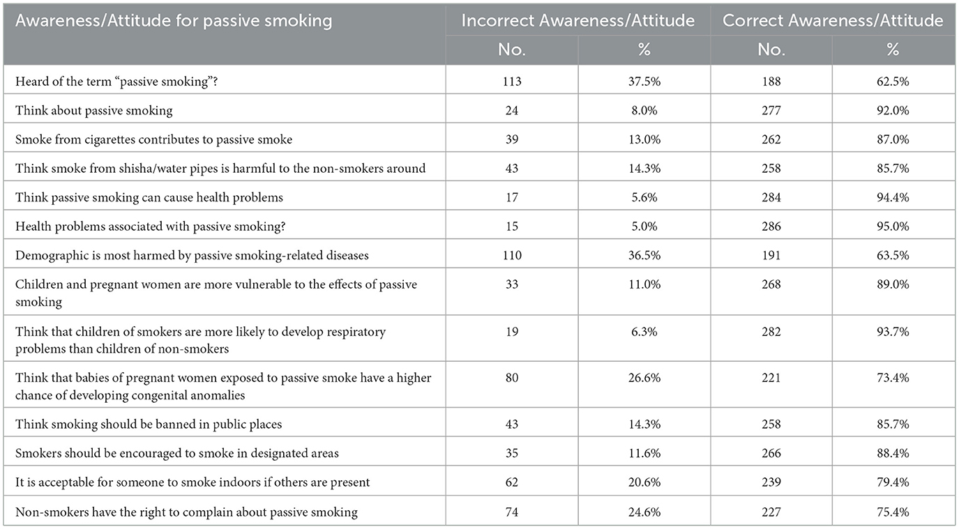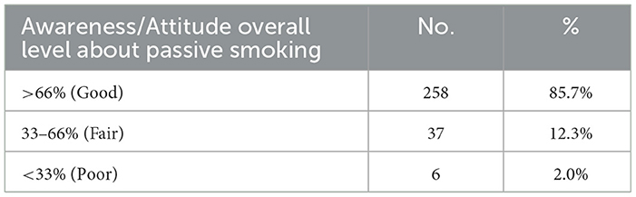 The overall level of awareness and attitudes regarding passive smoking among participants was predominantly positive (Table 3). A substantial majority, comprising 85.7% (n = 258), demonstrated a good level of awareness and attitude, scoring above 66%. Moreover, 12.3% (n = 37) of the participants exhibited a fair level of awareness and attitudes, falling within the 33%-66% range. Only a small fraction, 2.0% (n = 6), showed a poor level of awareness and attitude, with scores below 33%. This distribution indicated a generally high level of understanding and appropriate attitudes toward the risks and implications of passive smoking among the surveyed population.