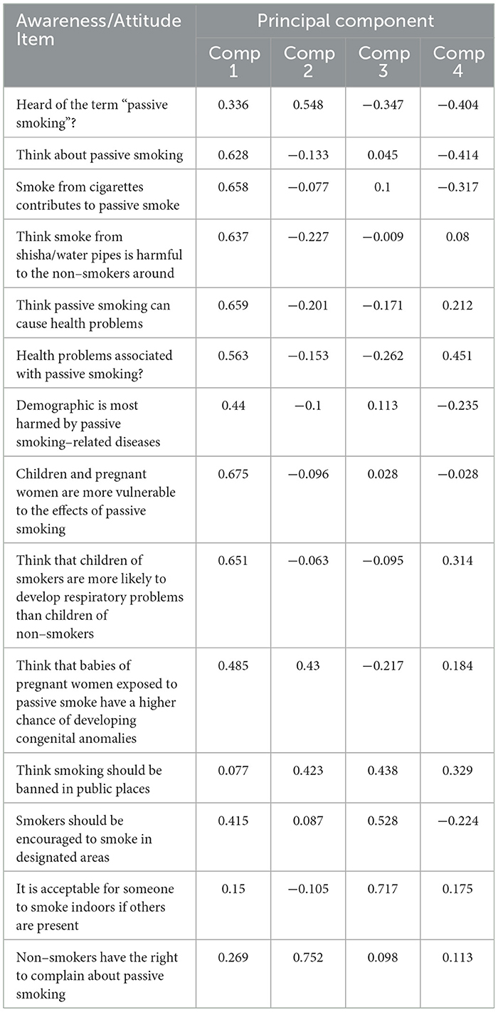 The PCA of awareness and attitude items regarding passive smoking revealed a multidimensional structure, capturing underlying patterns in the participants' responses. Four principal components were extracted (Table 2).