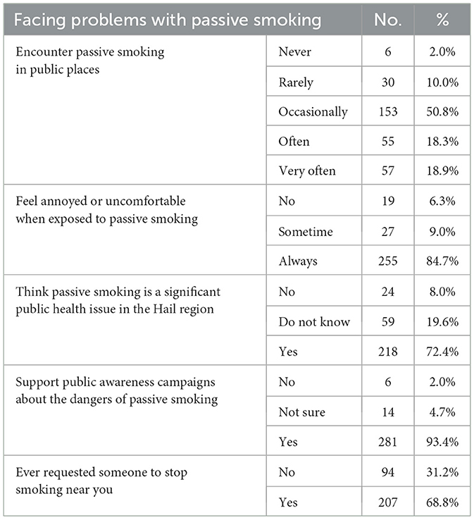 Within this global context, evidence from Saudi Arabia is notably limited. While regional studies indicate high exposure rates, particularly among youth (7), there is a lack of in-depth research assessing public awareness, attitudes, and exposure patterns following the implementation of Vision 2030 health initiatives and stricter tobacco control laws (33–35). The sociodemographic and cognitive factors shaping the public's understanding of SHS risks and support for protective policies are not well characterized. Therefore, this study aims to assess awareness and attitudes toward passive smoking, along with associated sociodemographic factors and exposure patterns within the Hail region of Saudi Arabia, to inform targeted and effective public health interventions and national tobacco control strategies.