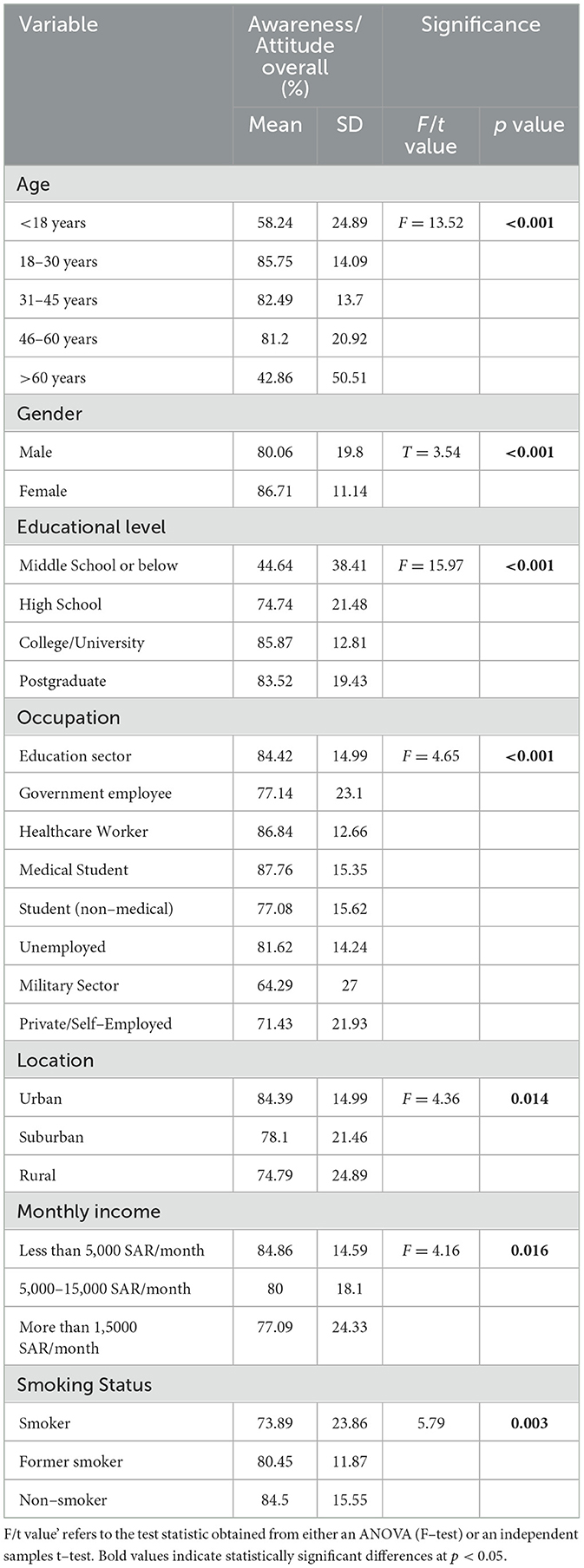 The associations between overall awareness and attitudes toward passive smoking and various sociodemographic variables revealed several significant findings (Table 5). Age showed a statistically significant association (F = 13.52, p < 0.001), with the highest awareness levels among individuals aged 18–30 years (mean = 85.75%, SD = 14.09), whereas those under 18 years and over 60 years had notably lower scores (58.24 and 42.86%, respectively). Gender also significantly differed (t = 3.54, p < 0.001), with females (mean = 86.71%) exhibiting higher awareness levels than males (mean = 80.06%).