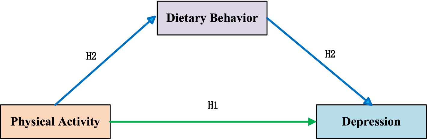 Building upon the above theoretical foundation, the present investigation postulates the following hypotheses: (1) Empirical analyses will explore the relationship between physical activity and depressive symptoms among university student populations; (2) Dietary behavior functions as a mediating pathway linking physical activity to depression outcomes in university students; (3) Network analytic approaches will intuitively clarify the interconnections between physical activity, dietary behavior, and depression. The conceptual model illustrating these hypothesised relationships appears in Figure 1.