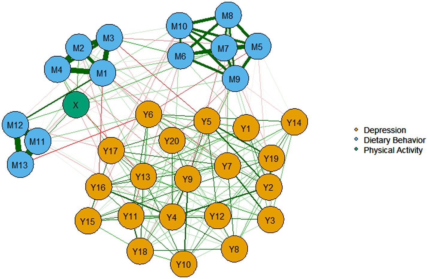 Previous investigations have primarily employed conventional measurement and intervention methodologies to substantiate the physical activity-depression linkage, often utilising latent variable modeling to characterise their associations (13, 34, 48, 63, 64). However, this relationship’s mechanisms and components have not been fully explored. Although path analysis has been used to elucidate the role of mediating factors such as dietary behavior, network analysis offers a more nuanced and in-depth approach, allowing for the direct examination of connections between observed variables.
