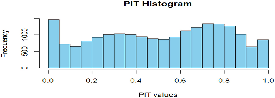 CPO and PIT values were computed to assess model predictive performance and calibration. Figure 5 shows the PIT histogram.