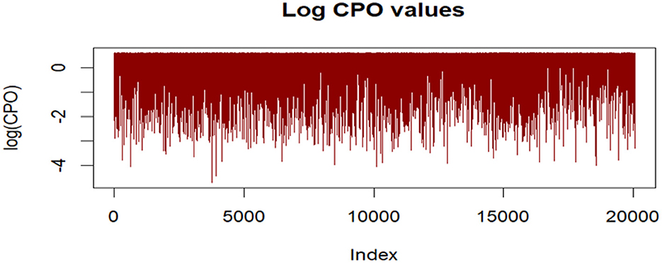 The histogram of PIT values approximated a uniform distribution, suggesting good model calibration. Additionally, no extreme outliers were identified in log(CPO) plots (Figure 6), supporting satisfactory predictive adequacy.