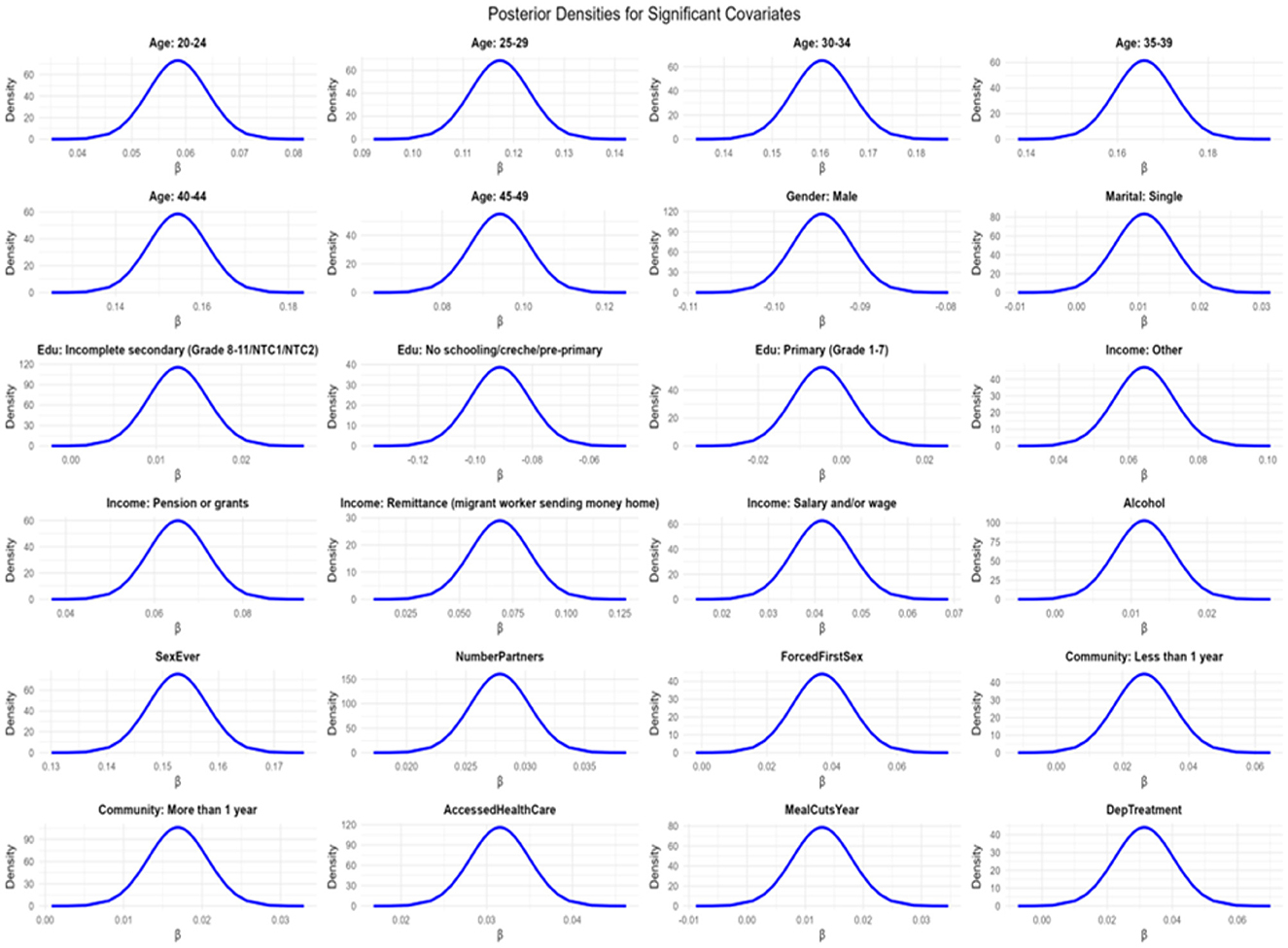 All categorical covariates were converted into factor variables, while binary variables were recoded to reflect binary responses as 1 (Yes) and 0 (No). The covariates considered in the analysis spanned several domains. Demographic variables included age group, gender, marital status, education level, and primary source of income. Behavioral variables encompassed alcohol use, sexual initiation, and number of sexual partners. Structural variables captured indicators of socioeconomic vulnerability and healthcare access, including food insecurity (measured by meal skipping, meal cutting, and running out of money), forced first sex, migration status (away from home), and level of community attachment. Additionally, a binary variable was included to capture mental health service utilization, specifically treatment for depression.