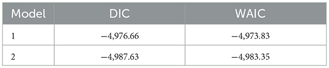 Table 4 summarizes the model fit statistics for the two candidate models. Model 2, which incorporated explicit penalized complexity (PC) priors, yielded marginally lower DIC and WAIC values compared to Model 1, indicating slightly better fit. Given that the differences were modest, this comparison provides reassurance that the findings are not sensitive to prior specification.