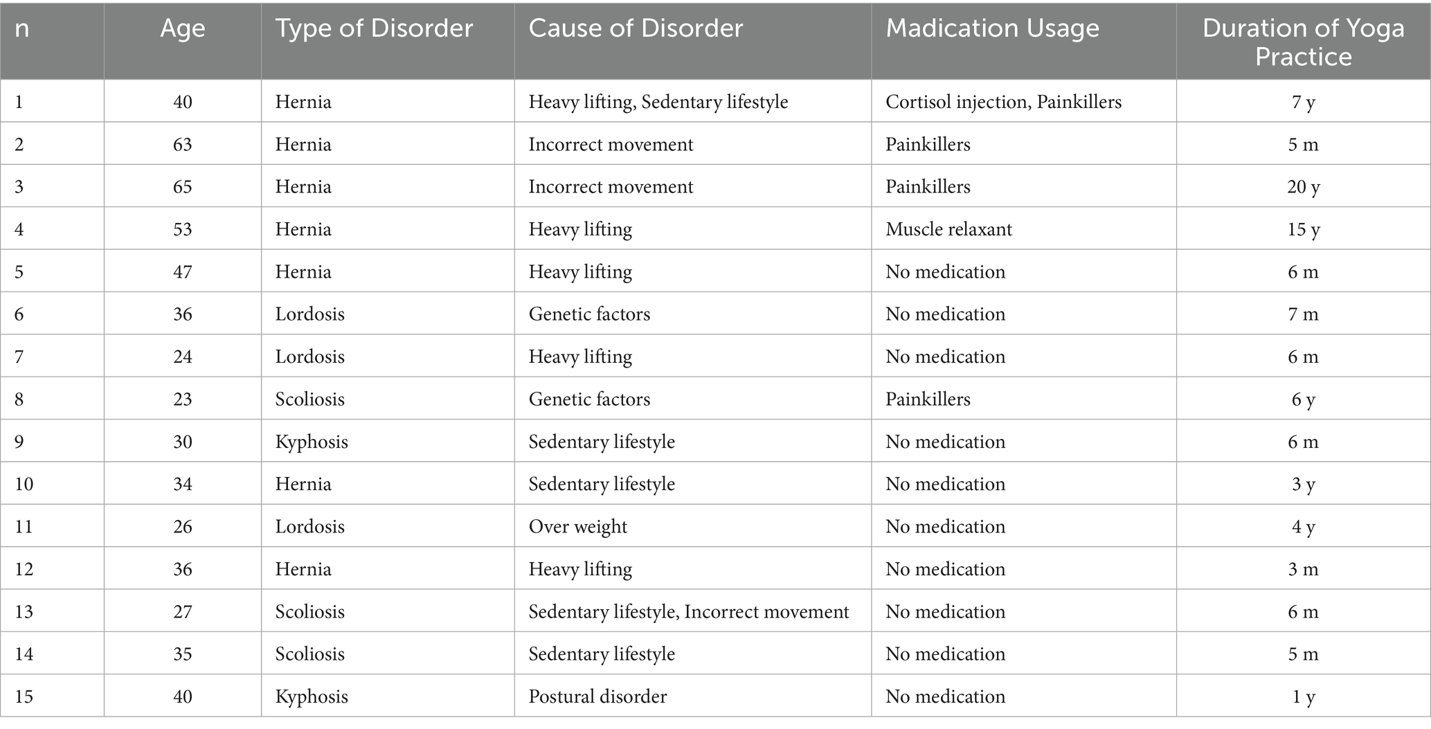 The study group consisted of 15 adult individuals diagnosed with a spinal disorder and regularly engaged in yoga practice. According to Creswell and Creswell (33), the number of participants in phenomenological research may range between 3 and 10; thus, it was assumed that the sample size in this study was sufficient for data saturation. The sample size was determined by referencing previous studies with a similar research methodology in the literature: Küçükalpelli et al. (34) and Davenport et al. (47). Participants were selected using the convenience sampling method. Frequently used in qualitative and quantitative studies (35), convenience sampling is one of the most common sampling strategies and is often employed when participants are easily accessible (36). However, this sampling method may limit the generalizability of the findings, as participants who are readily available might not represent the broader population of individuals with spinal disorders. The inclusion criteria for participant selection were as follows: having at least 3 months of yoga experience; having received a medical diagnosis of a spinal disorder (e.g., hernia, lordosis, scoliosis, kyphosis) through physician-conducted examinations and tests; and having no history of spinal surgery. Additionally, since the study focused on both physical and mental outcomes, the presence of clinical conditions such as schizophrenia, bipolar disorder, depression, or severe anxiety was determined as an exclusion criterion. Demographic information of the participant group is presented in Table 1.