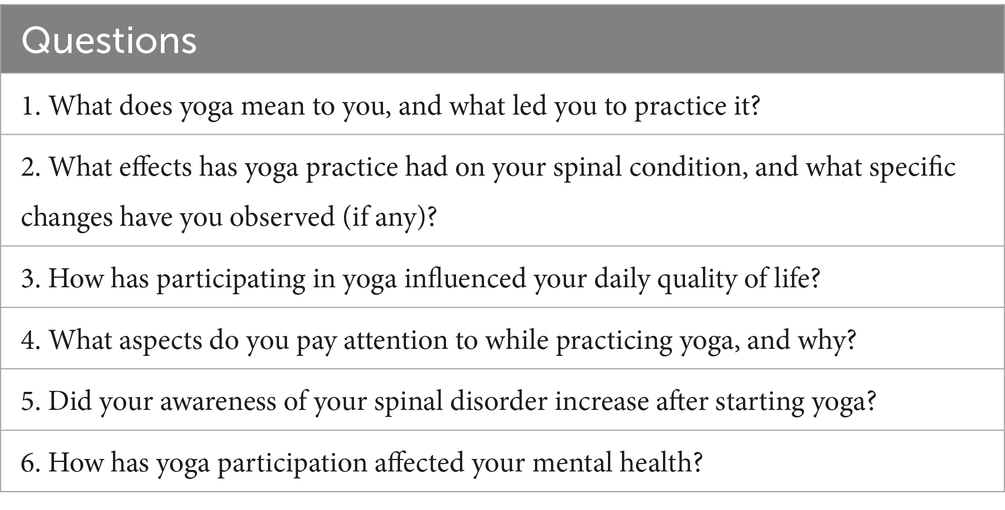 Data were collected using a semi-structured interview technique. Semi-structured interviews balance the rigidity of fully structured interviews and the flexibility of unstructured interviews, positioning themselves between these extremes (33). Each interview lasted approximately 45–60 min and focused on questions designed to elaborate on the participants’ yoga experiences.